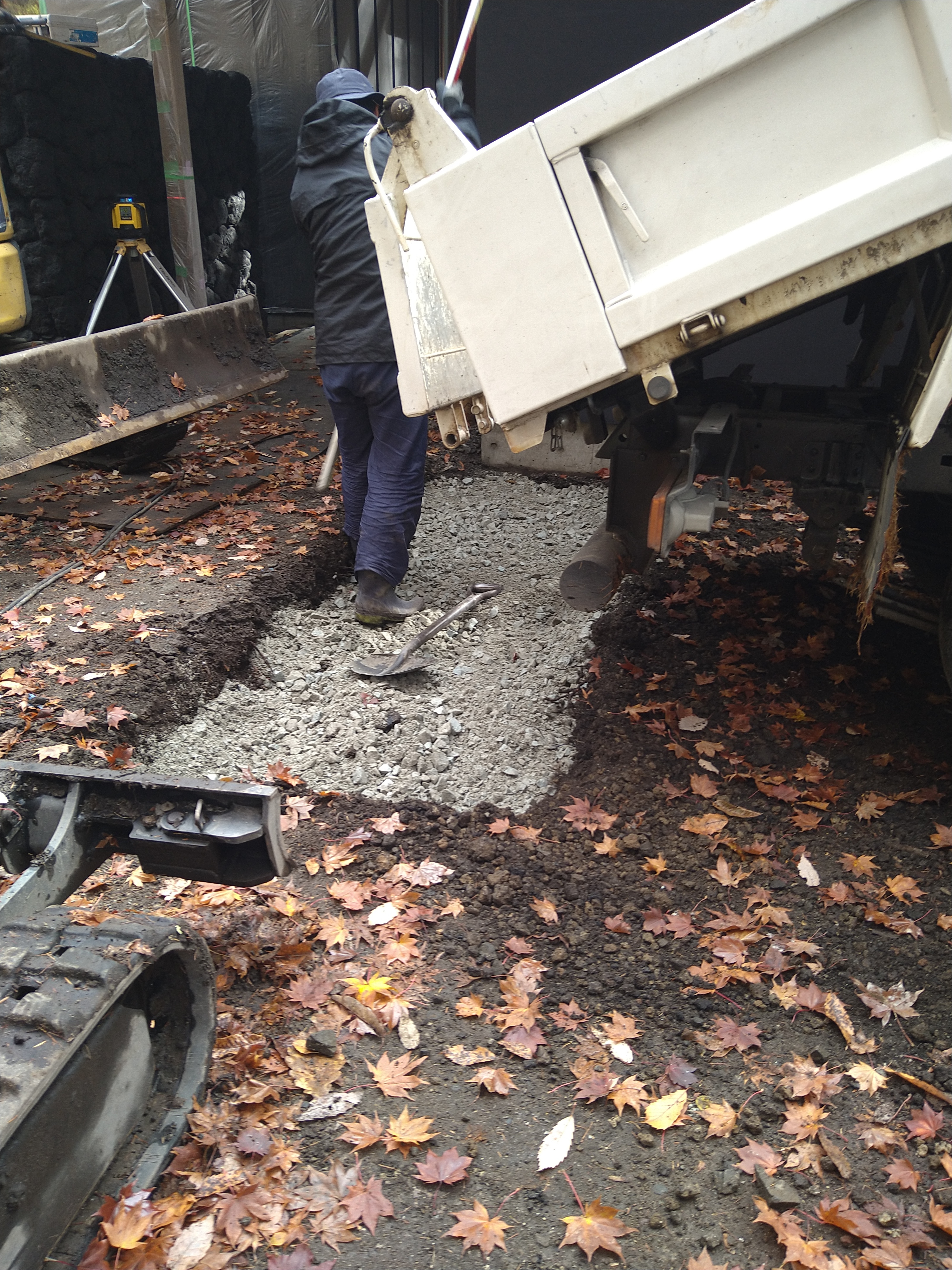7時半、浅間石200~300を2㎥を積み込み現場に向いました!現場で石を下ろし、石積み基礎で使う砕石を運搬し、もう1台のダンプに洗砂を積んで材料の段取りをしました!ダンプ、ミニユンボ、ユンボ、プレート使用で人員2名です!