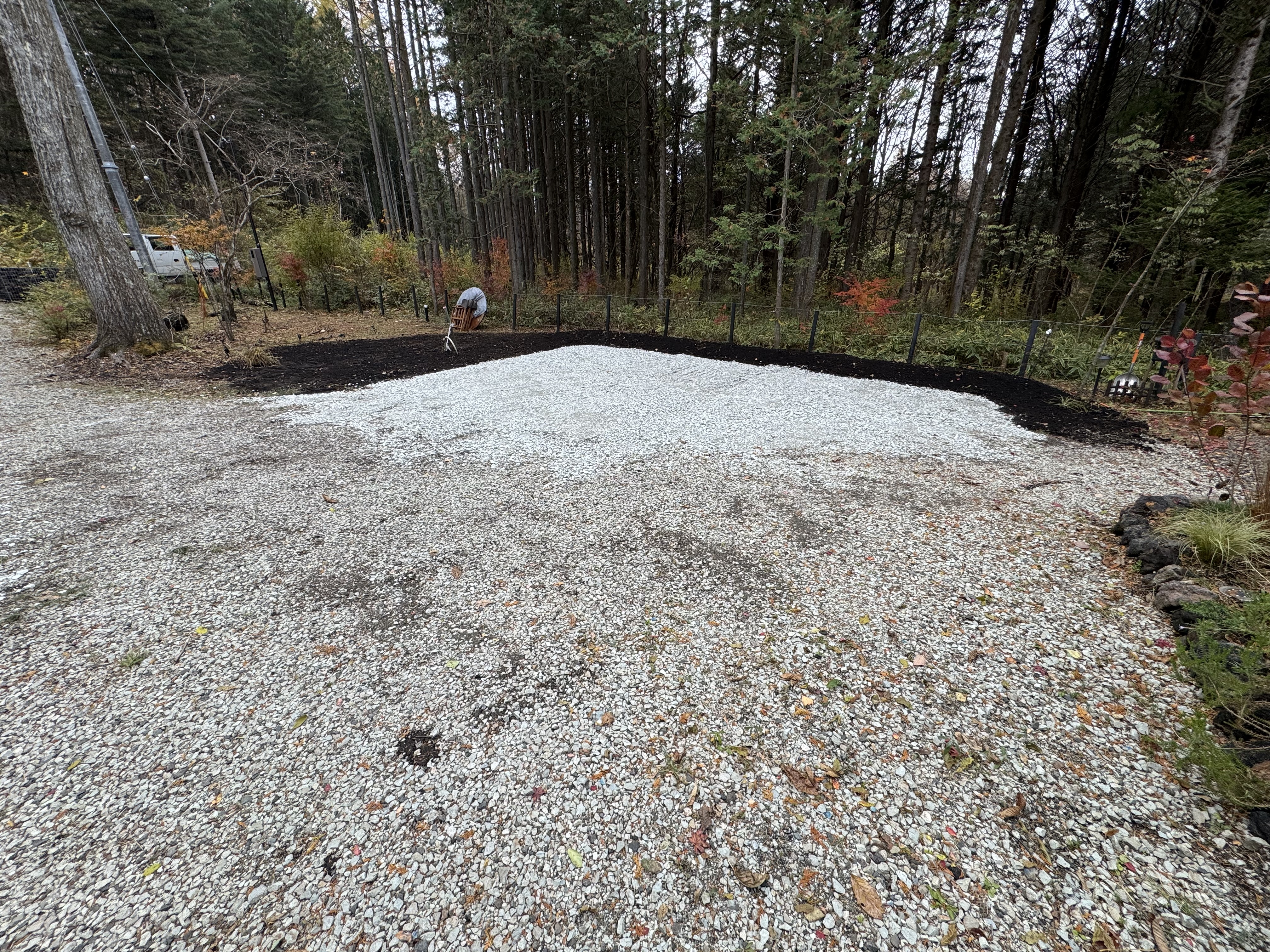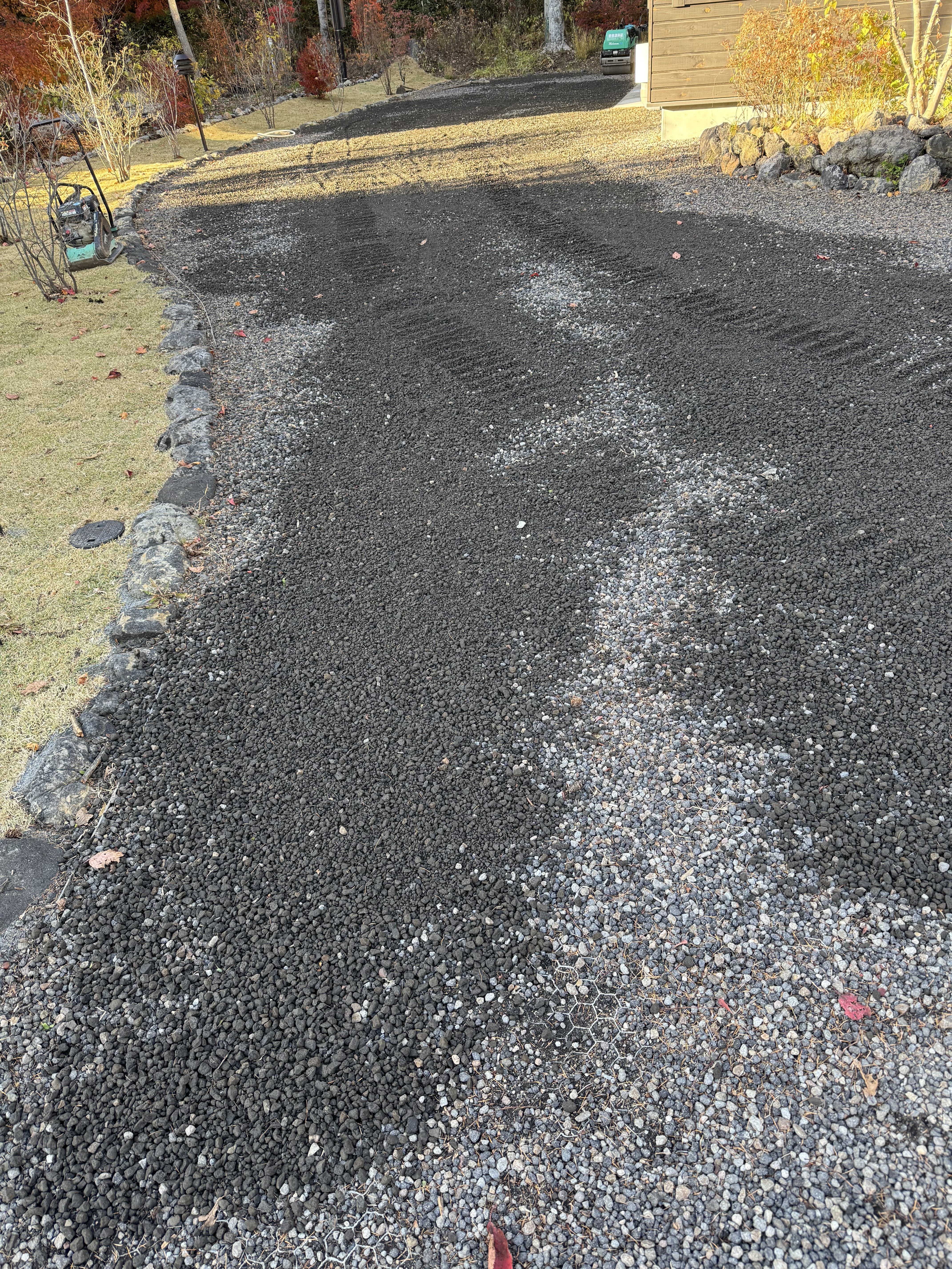 9時から14時、GH様邸、掘削、グリ石敷き(3m3)、ビリ(置場から砂利の混ざったビリ)1.5m3、c-40を2.5m3敷きならし