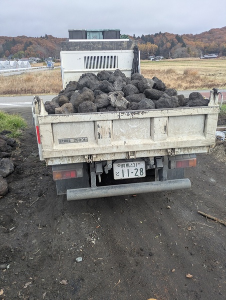 自社資材置き場で、浅間石のグリを一台積み込み移動