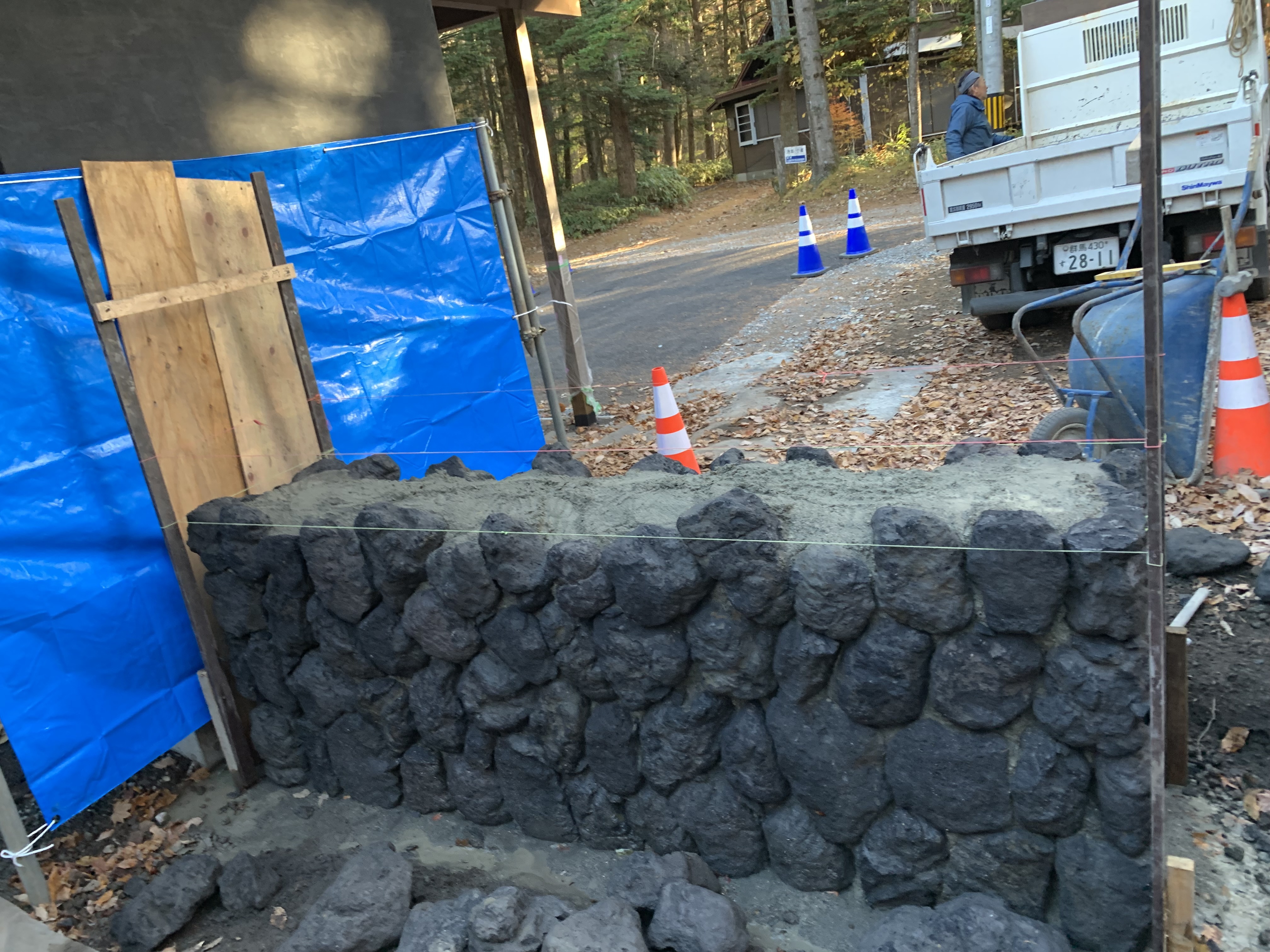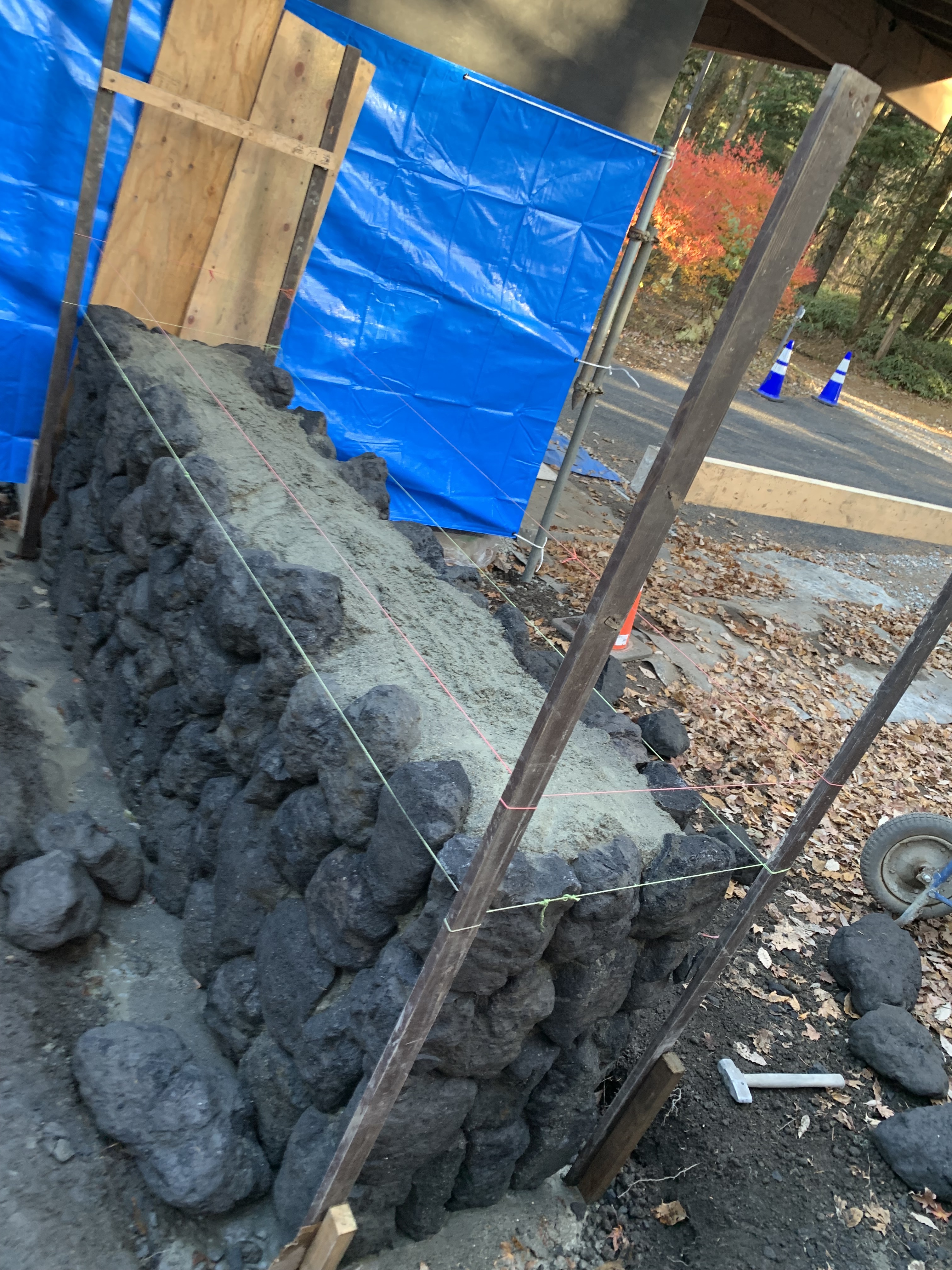 石積み(7段中4段完了)、モルタル打設、洗い、3時半から置き場で浅間石70個拾い出し積み込み