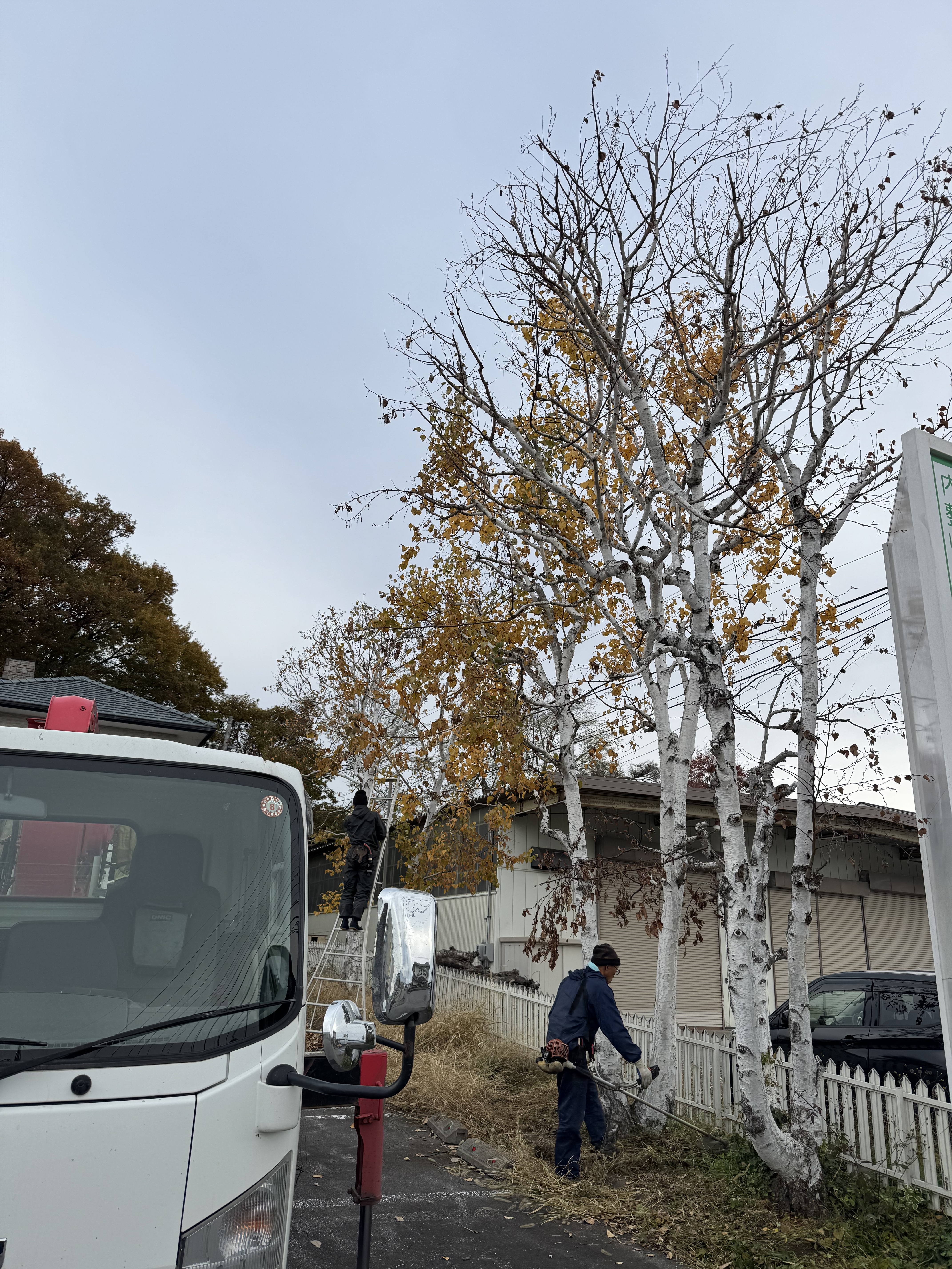 8時から16時10分、USD様邸、ツツジ、ツゲ、ニシキギの刈り込み、シラカバ、モミジ、サルスベリ他、剪定、草刈り、落ち葉掃除