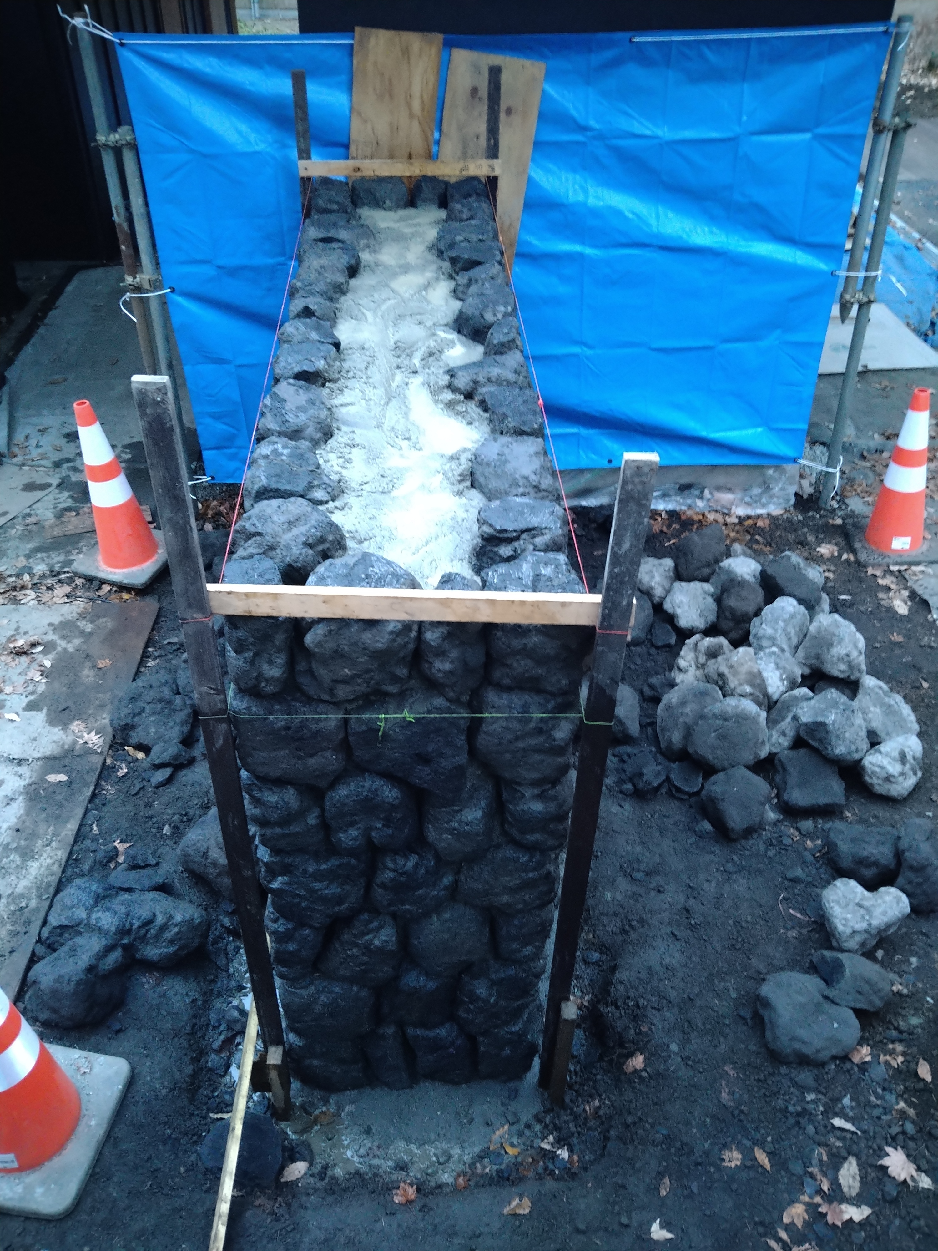 7時半から配石し、5段目石積み、モルタル打設、石洗いをして積んでいる間に、石を加工したクズを片付けたりしました!