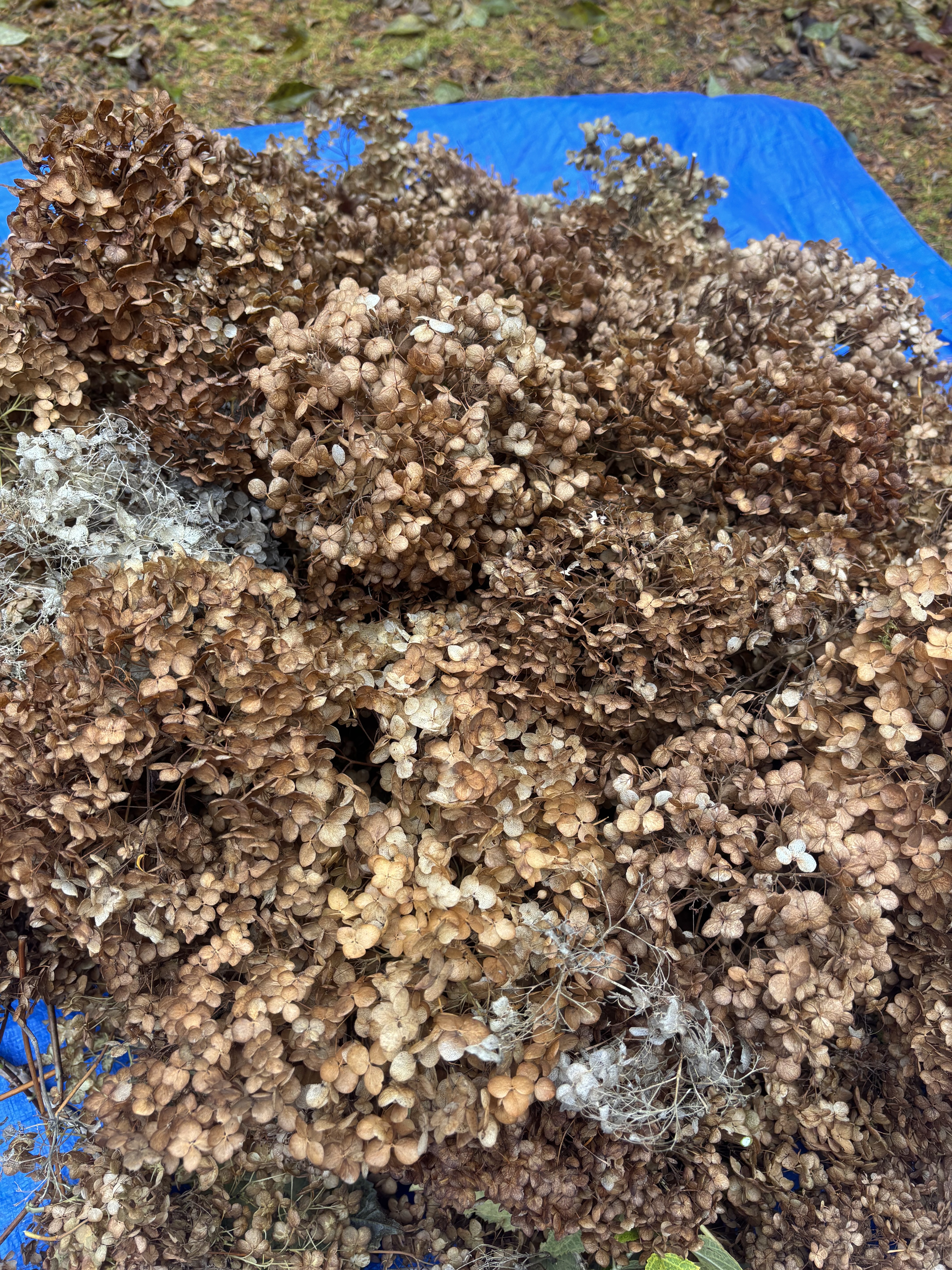 刈り込み アジサイの枯れた花切り 剪定ゴミ片付け ブロアーで清掃作業を行いました。