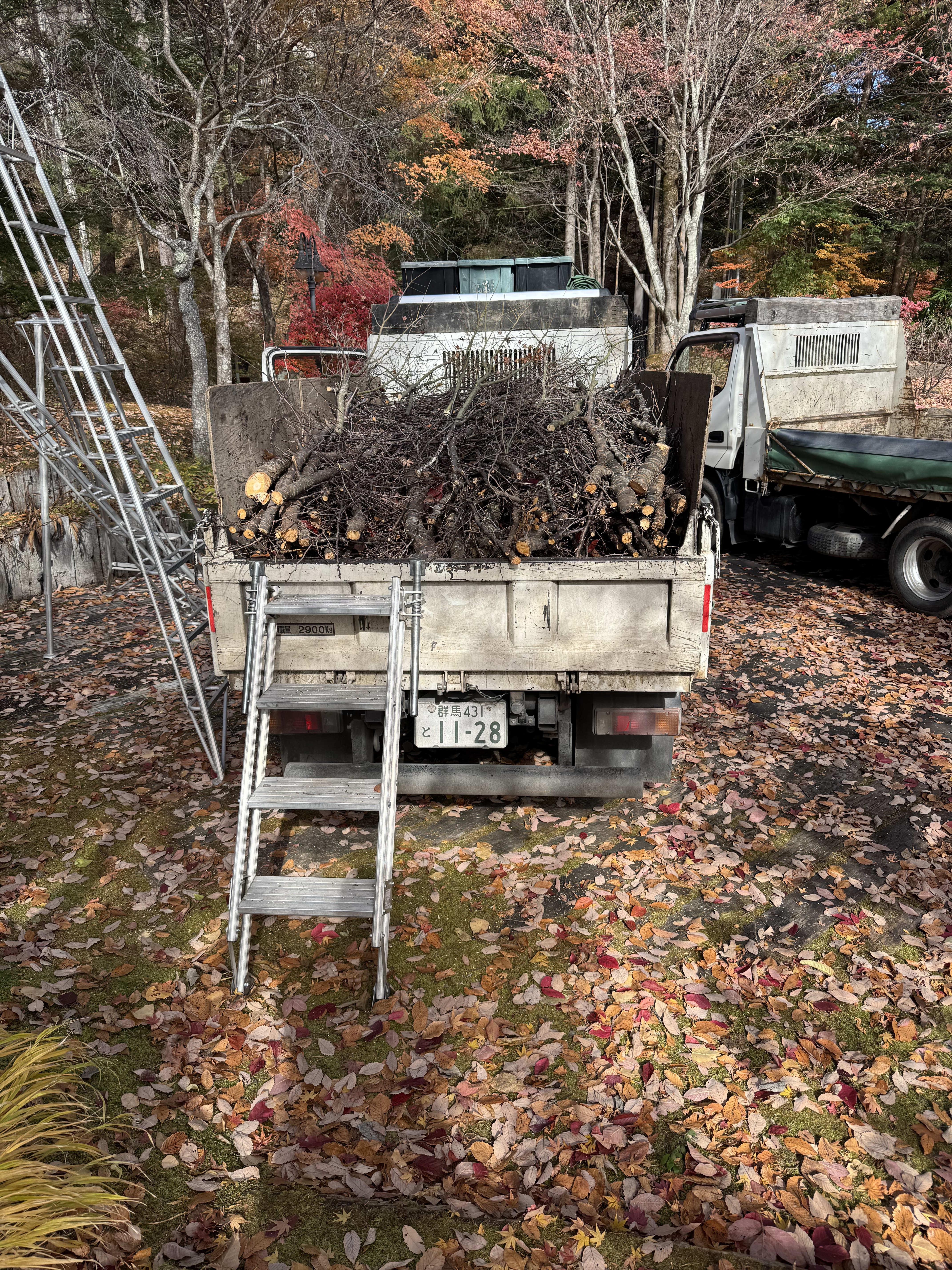 ナラ、サクラの頭止め、人員3人、使用機械、ダンプ、チェーンソー