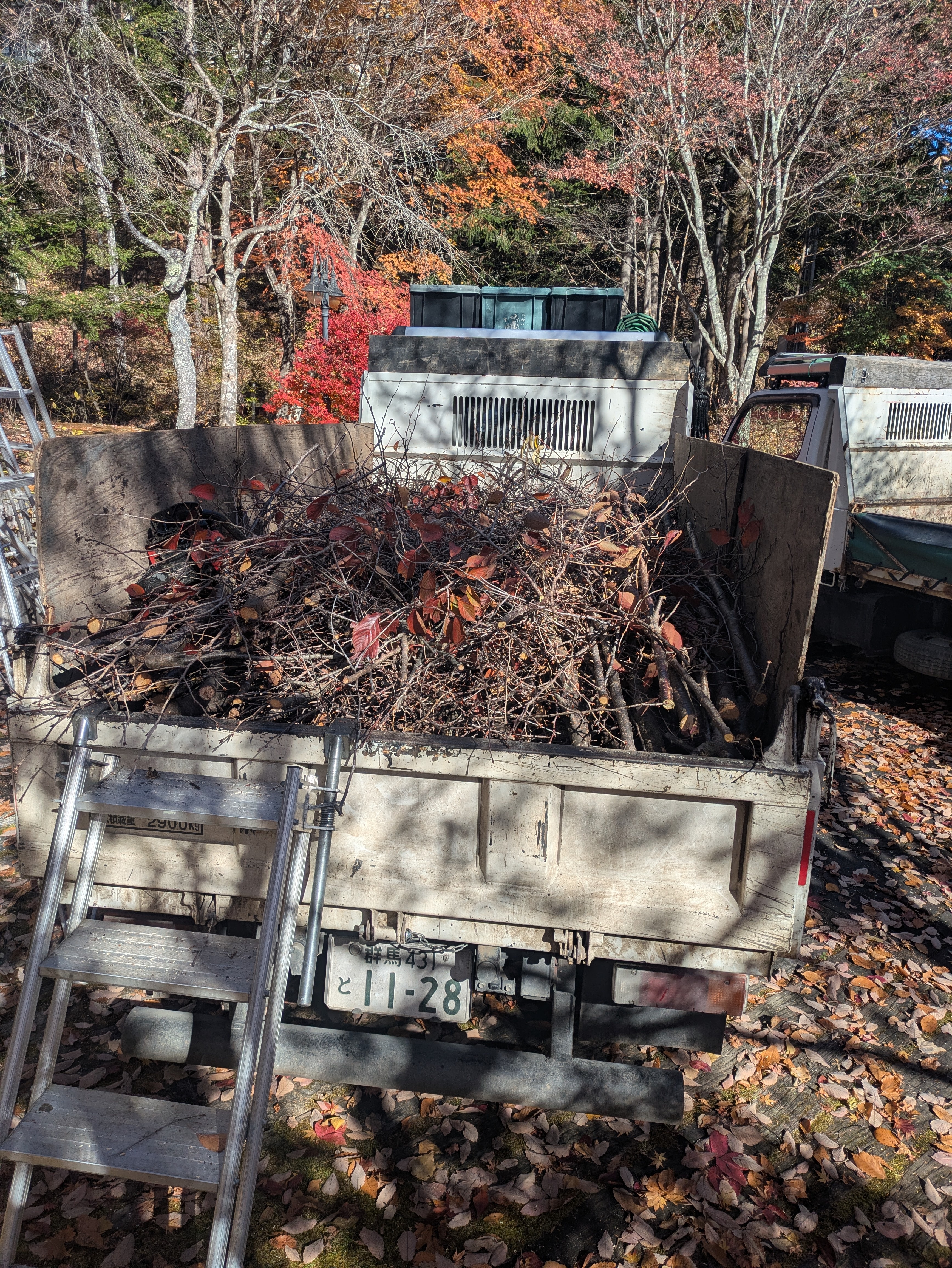 枝払い後の枝ゴミ片付け、ダンプ積み込み 枝ゴミは、積み置きで
