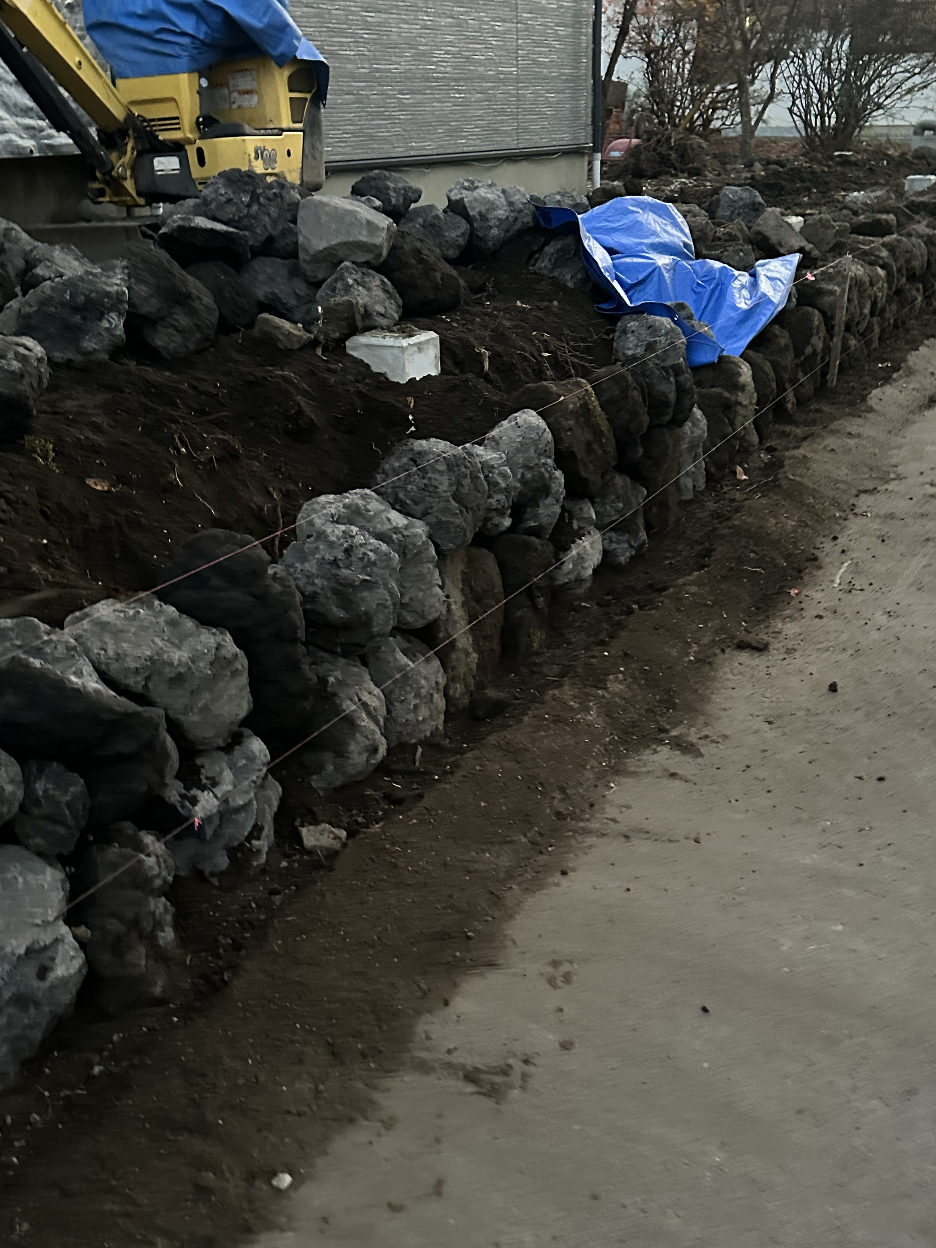 午後から半分ミニユンボで掘削 途中浅間石を調達。