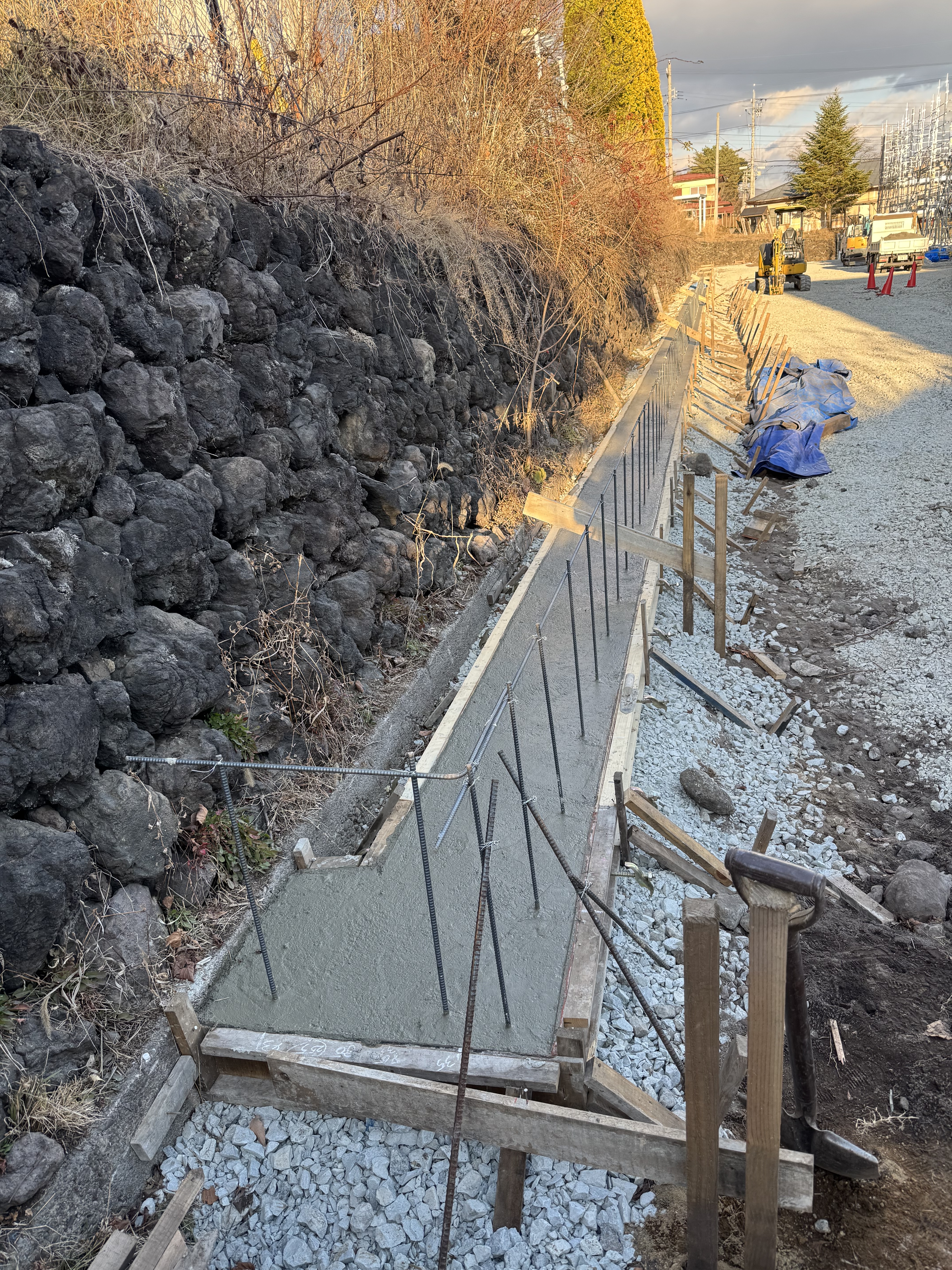 7時30分から17時、DHS様邸、ブロック基礎、砕石入れ4m3、生コン2.5m3打設、(ベースコン33m、砕石45m完了)