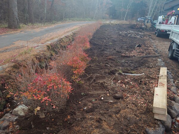 15時30分MDK様邸に戻り植栽、ミニユンボで穴掘り、ドウダン大20か所、