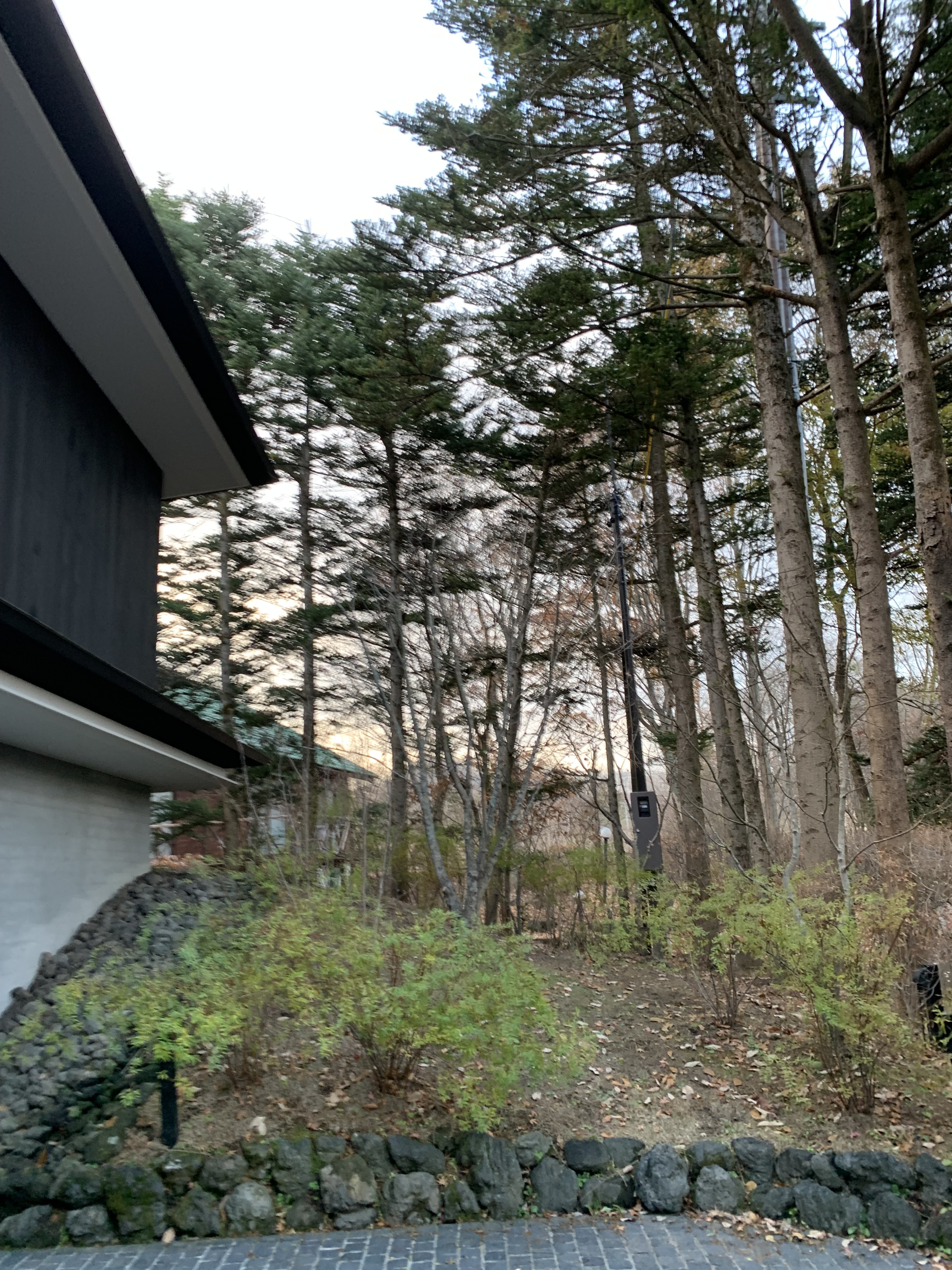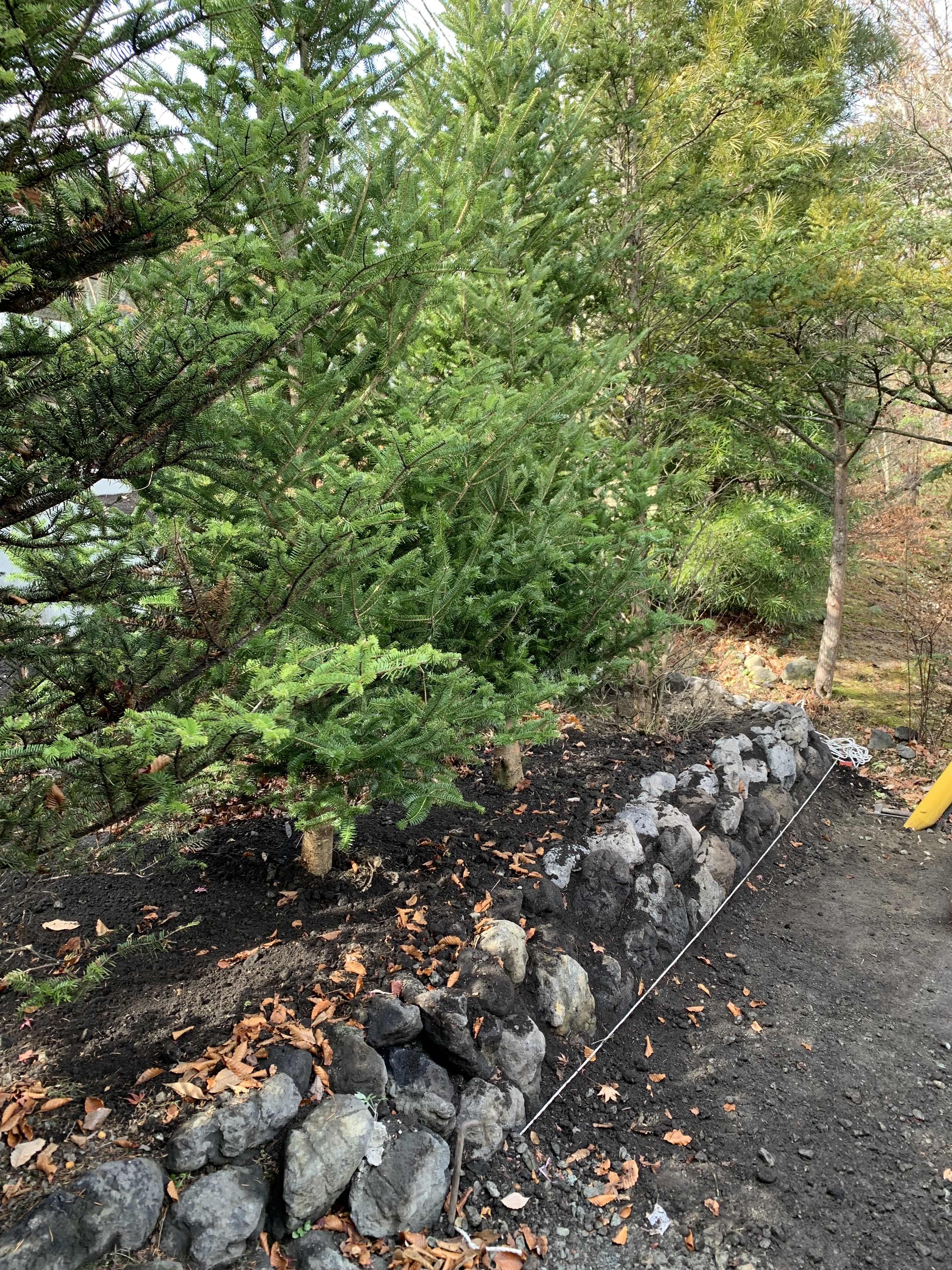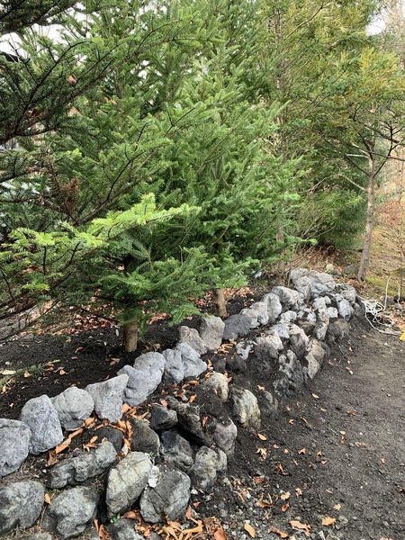 植栽(既存植木2本、新規2本)、水やり、整地、石積み(くずれ積み約4m、その後現場監督から石積みと植木の間に浅間石を置く様頼まれたので約6m設置)、置き場から浅間石40個拾い出し運搬、ミニユンボを他現場へ運搬、人員2名に落ち葉掃除を任せてKOU様邸へ