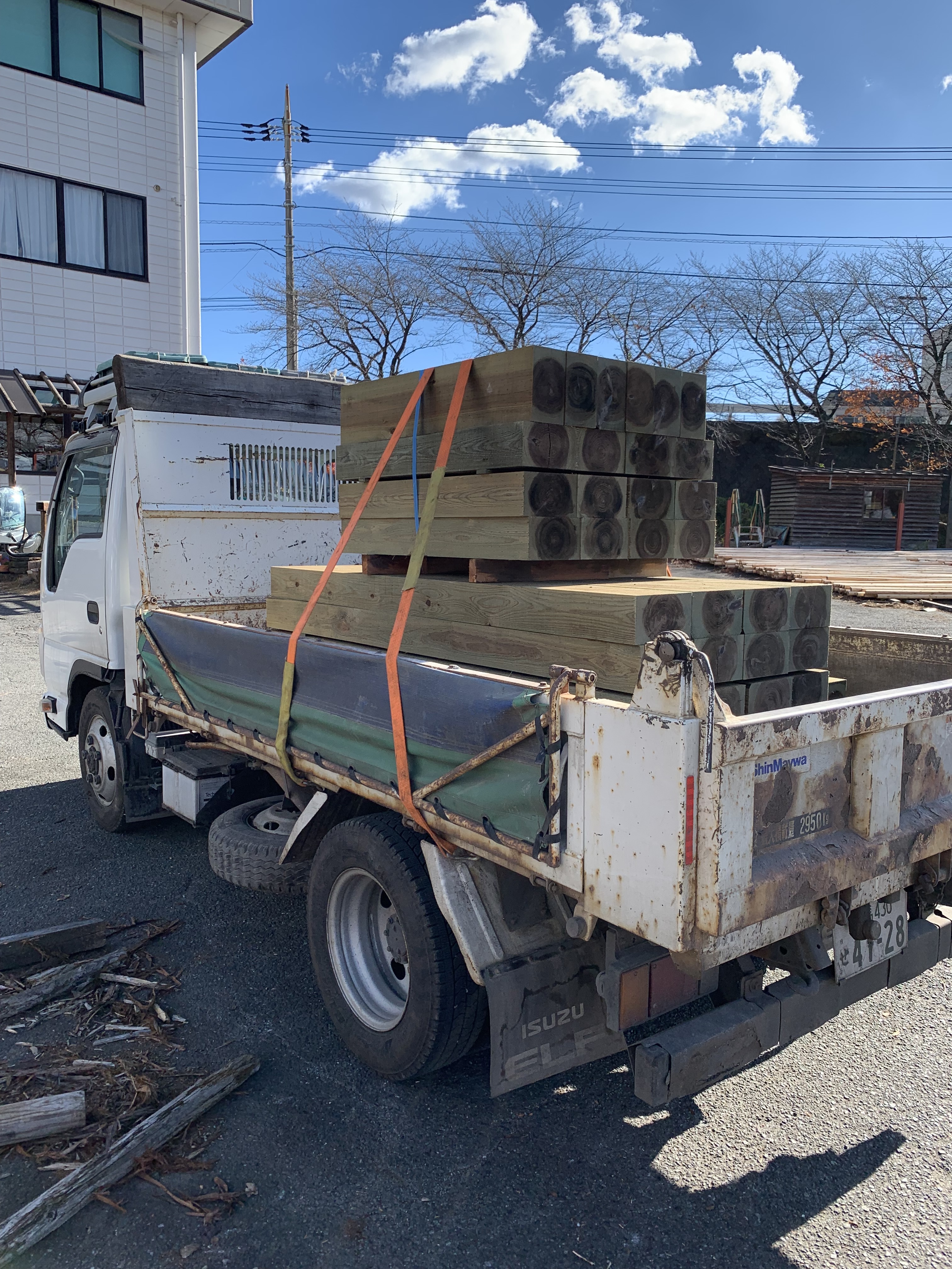 材木屋さんで枕木を引き取りMTM様邸へ運搬