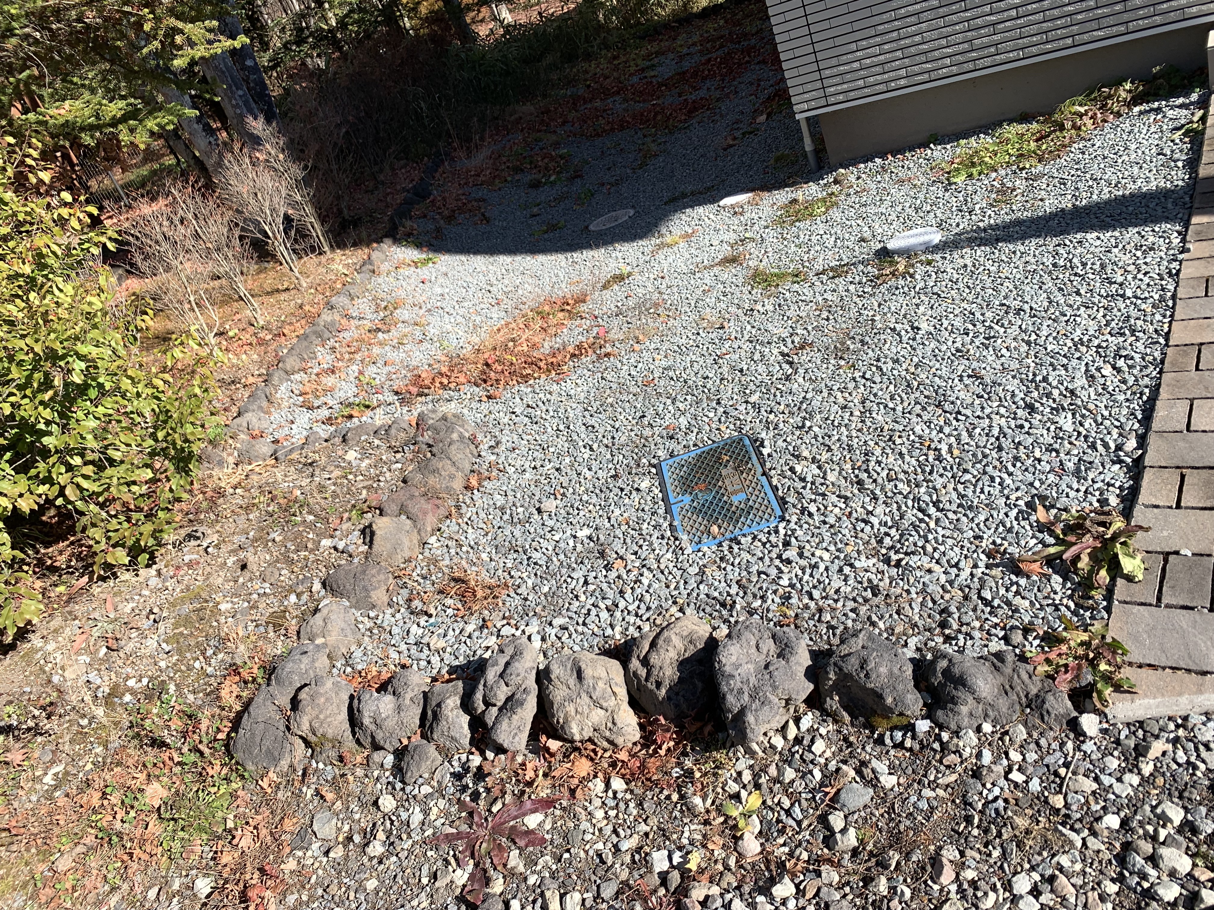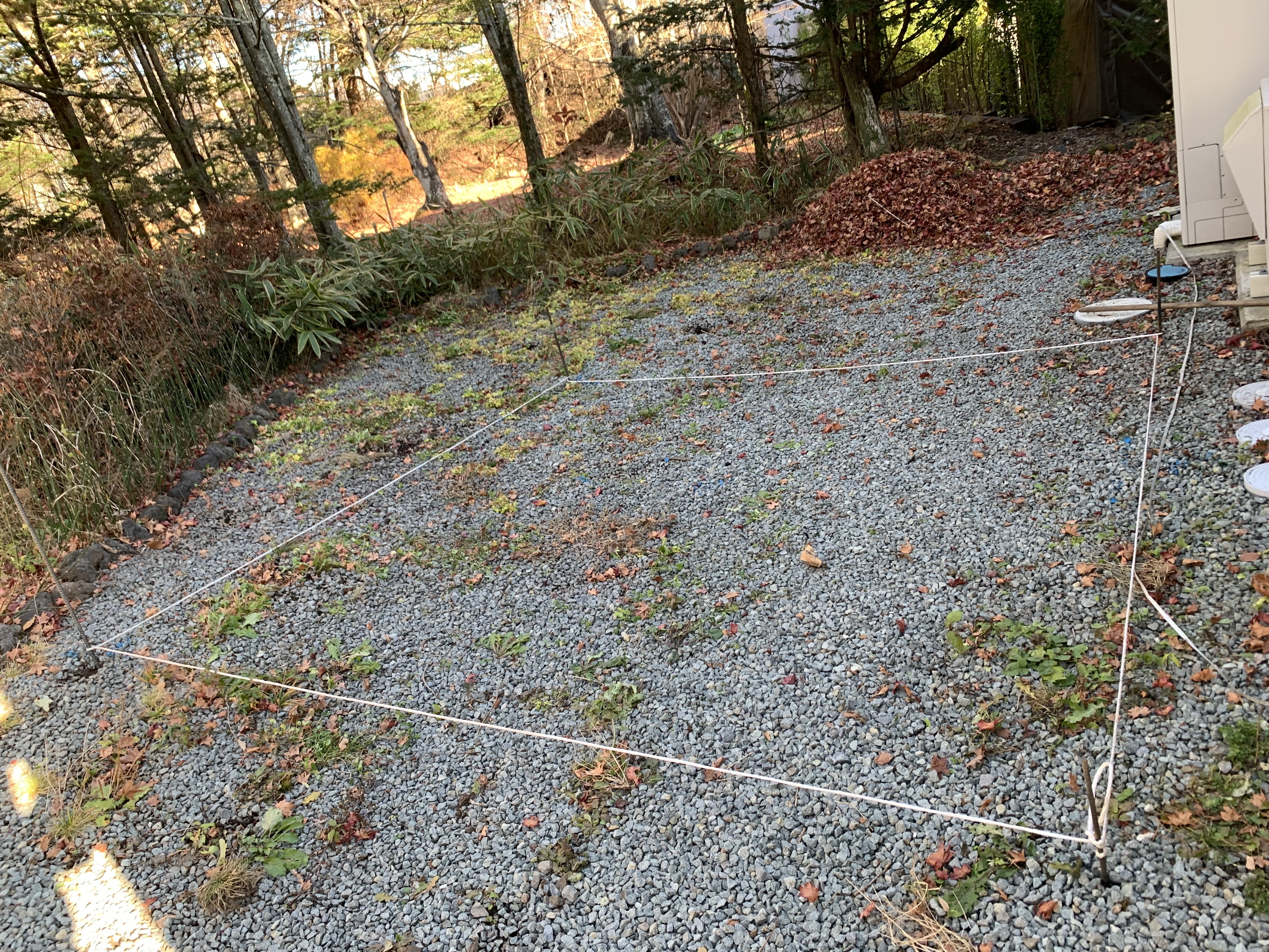 枕木積み下ろし、落ち葉掃き、テラス位置出し、施主様に位置及び高さの確認をしてもらう