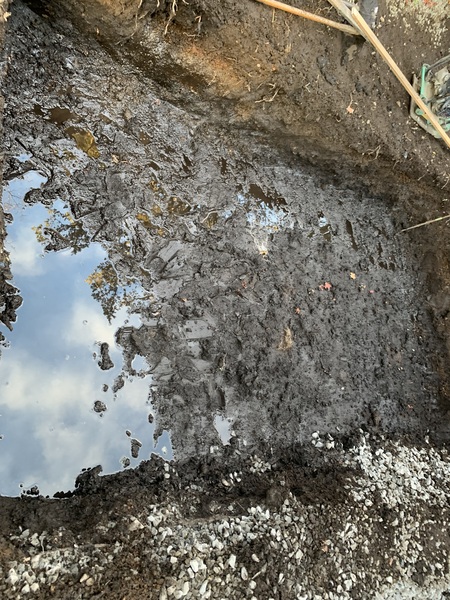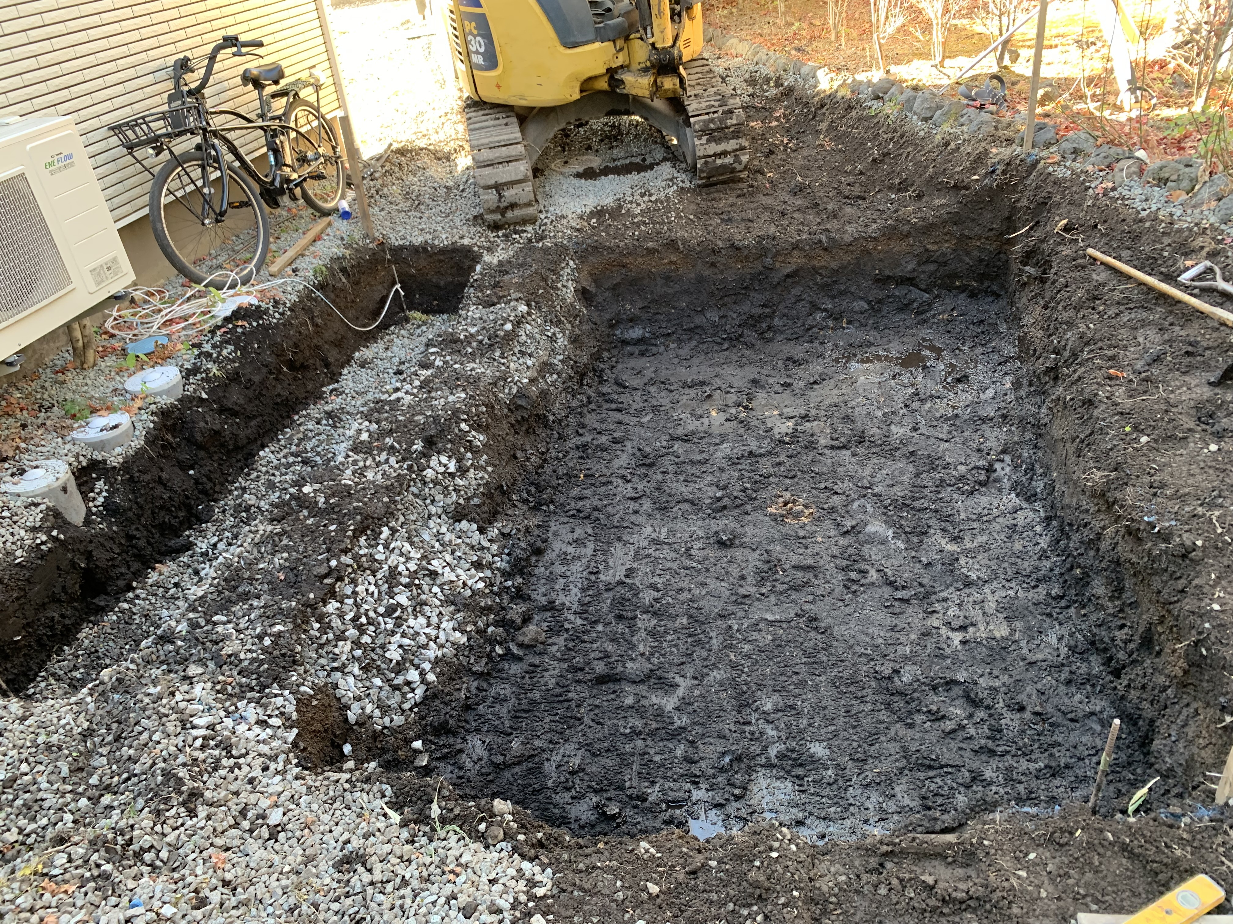テラス掘削(残土3台置き場へストック、掘削途中で水が湧いてきたため、施工法を変え掘削高を下げ暗渠パイプを設置することで湧水に対応することとする