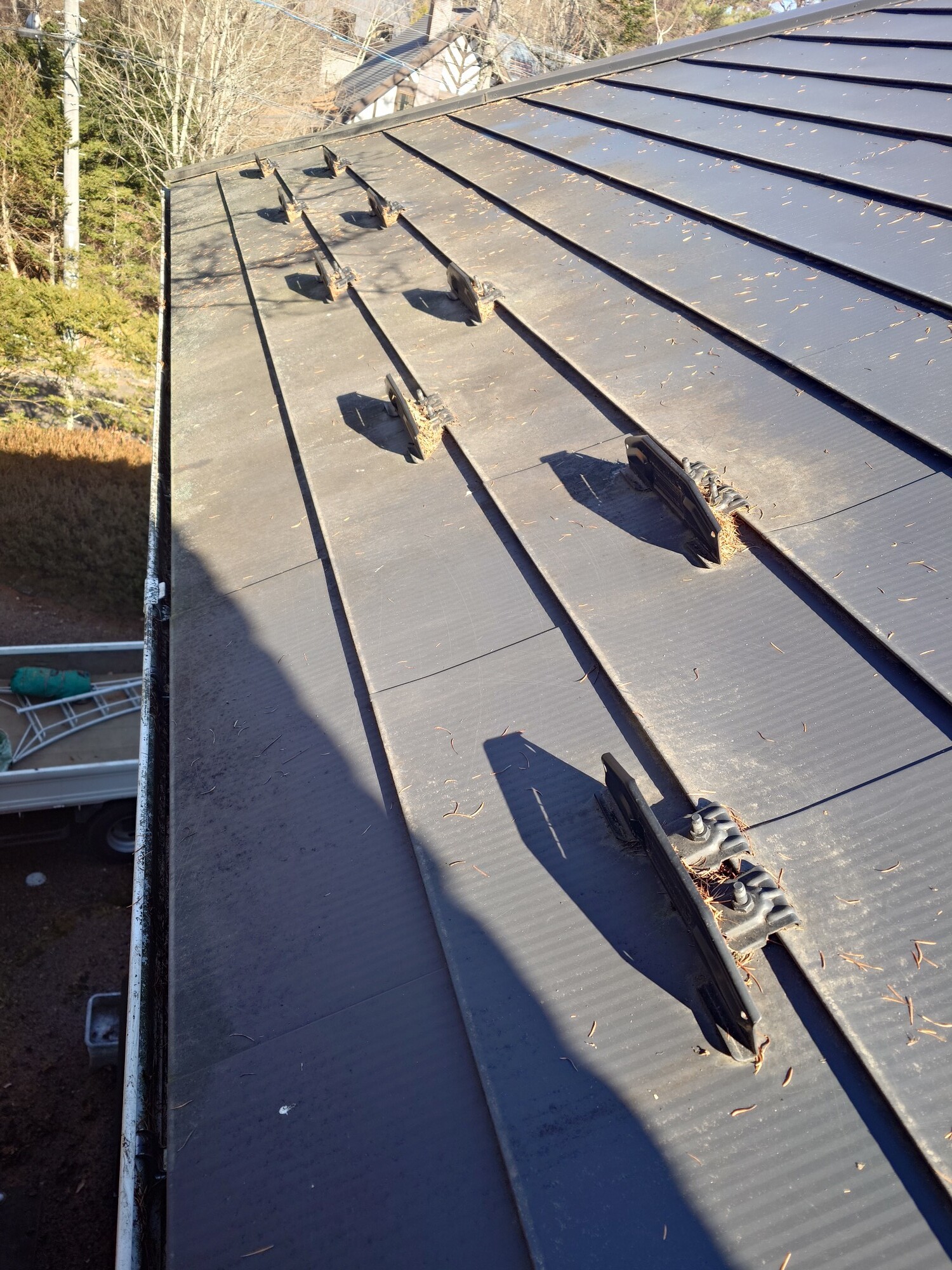 9時30分からYG様邸・ユニックかご使用で雨樋、屋根掃除。11時20分まで。