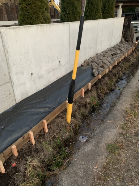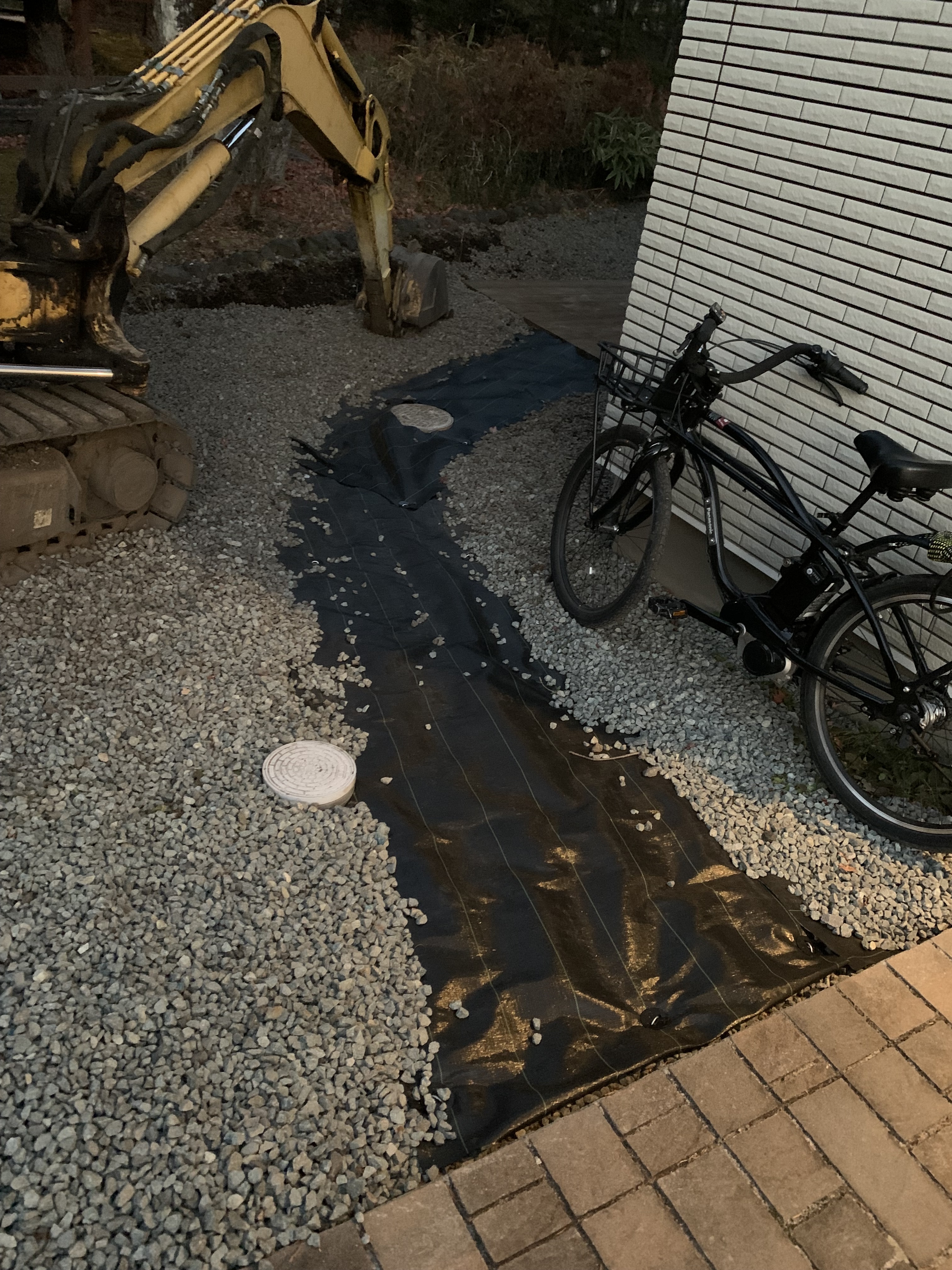 南側斜面土留(杭打ち、矢板止め約10m、防草シート設置、浅間石敷き詰め約5m完了)