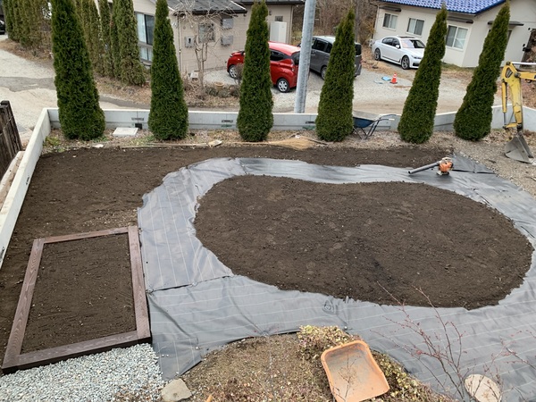 砕石混じりの表土を剥ぎ取り黒土と入れ替え(材料屋さんから黒土2台運搬、表土は置き場へ2台運搬)