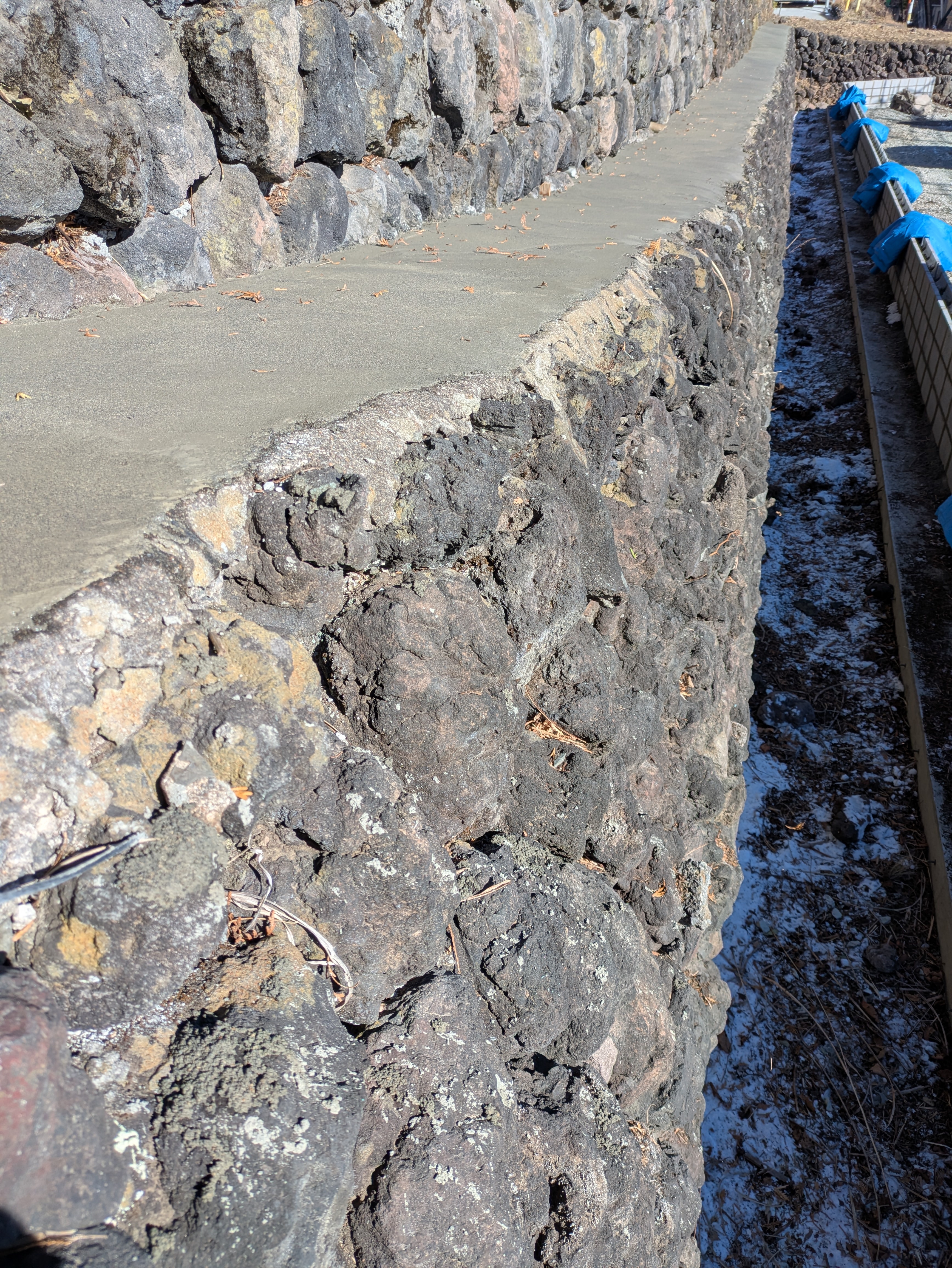 昨日外したフェンスの下の石積み天端のモルタル打設39m