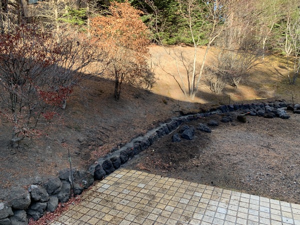 丁張り出し、石積み(約8m、当初既存石積みの上に1〜2段積み足す設計だったが、既存石積みにモルタルが使われておらず石積みの強度に問題があるため、既存石積みを組み直してモルタルを使用する設計に変更する)、
