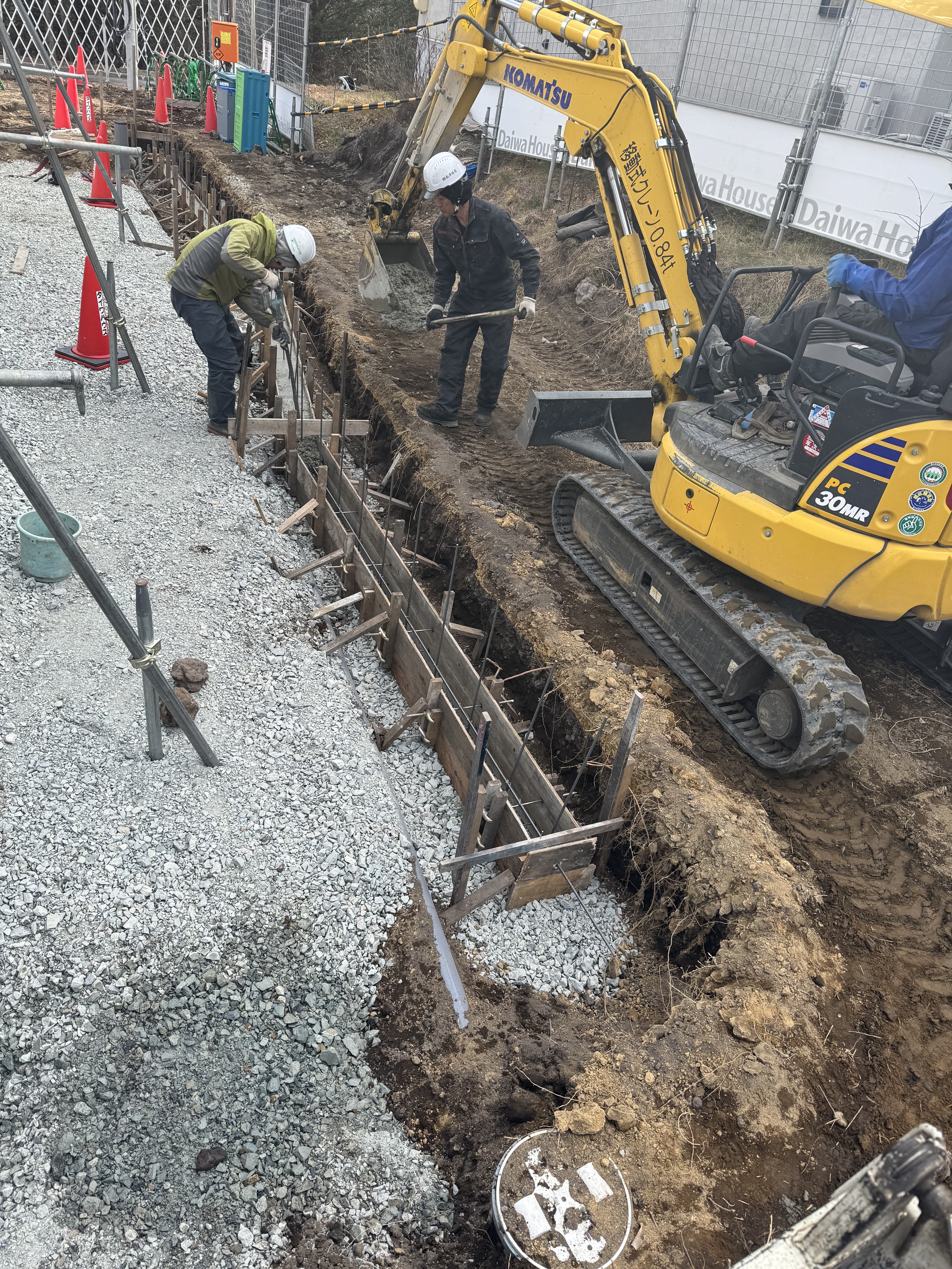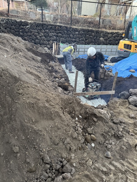 ブロック基礎の掘削、砕石入れ約6m、丁張りかけ