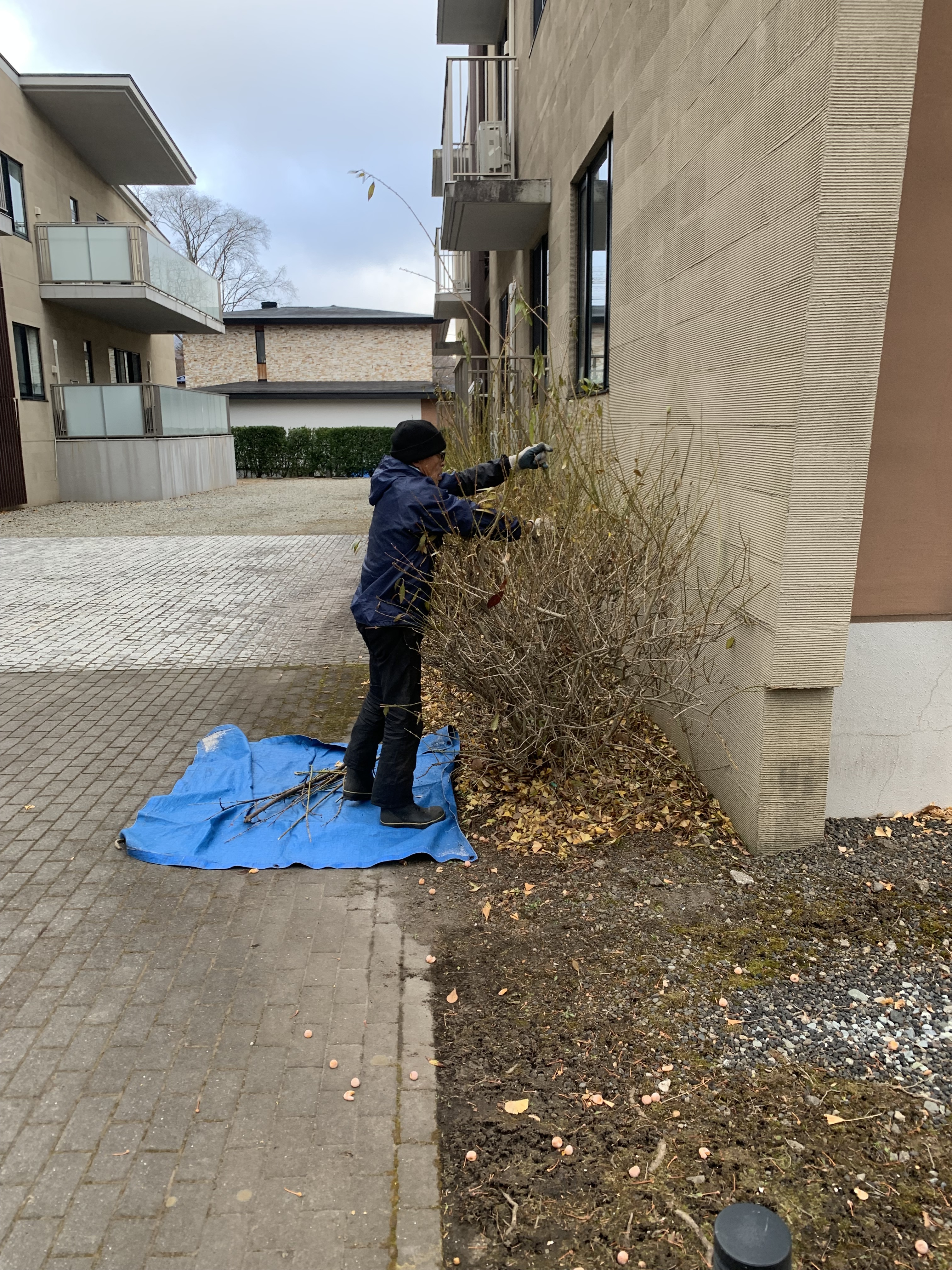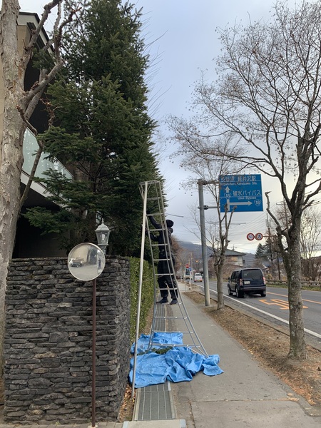 外周刈り込み(完了)、剪定(中庭完了、外周ケヤキ2本残し)、伐採(モミジ1本)、掃除