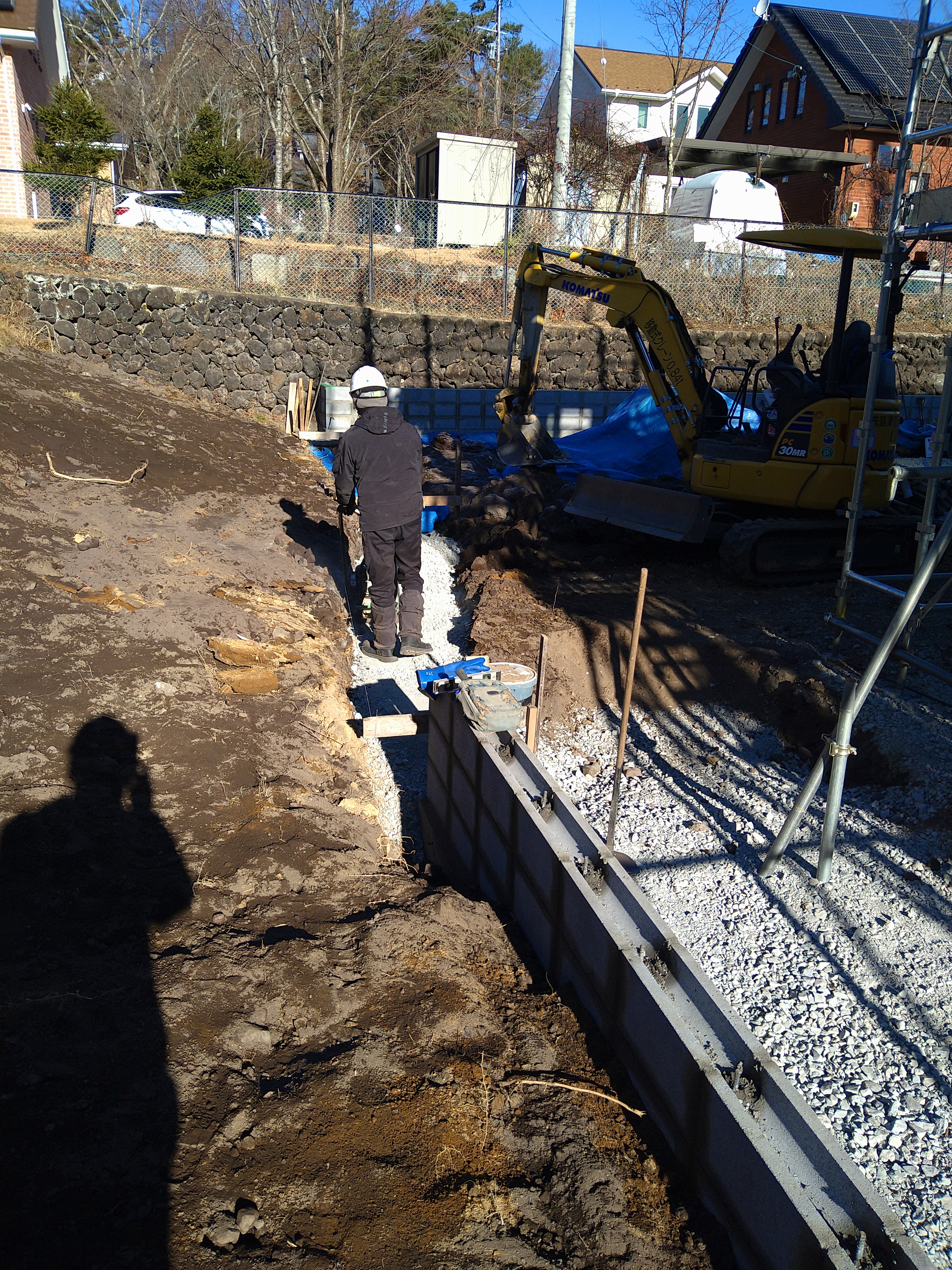 西側ブロック工の北側との間を掘削して砕石搬入、転圧しました!掘削残土を北側ブロックと石垣の間の植栽ゾーンに埋戻しで使いました!作業の合間に型枠の段取りや石片付けをしました!