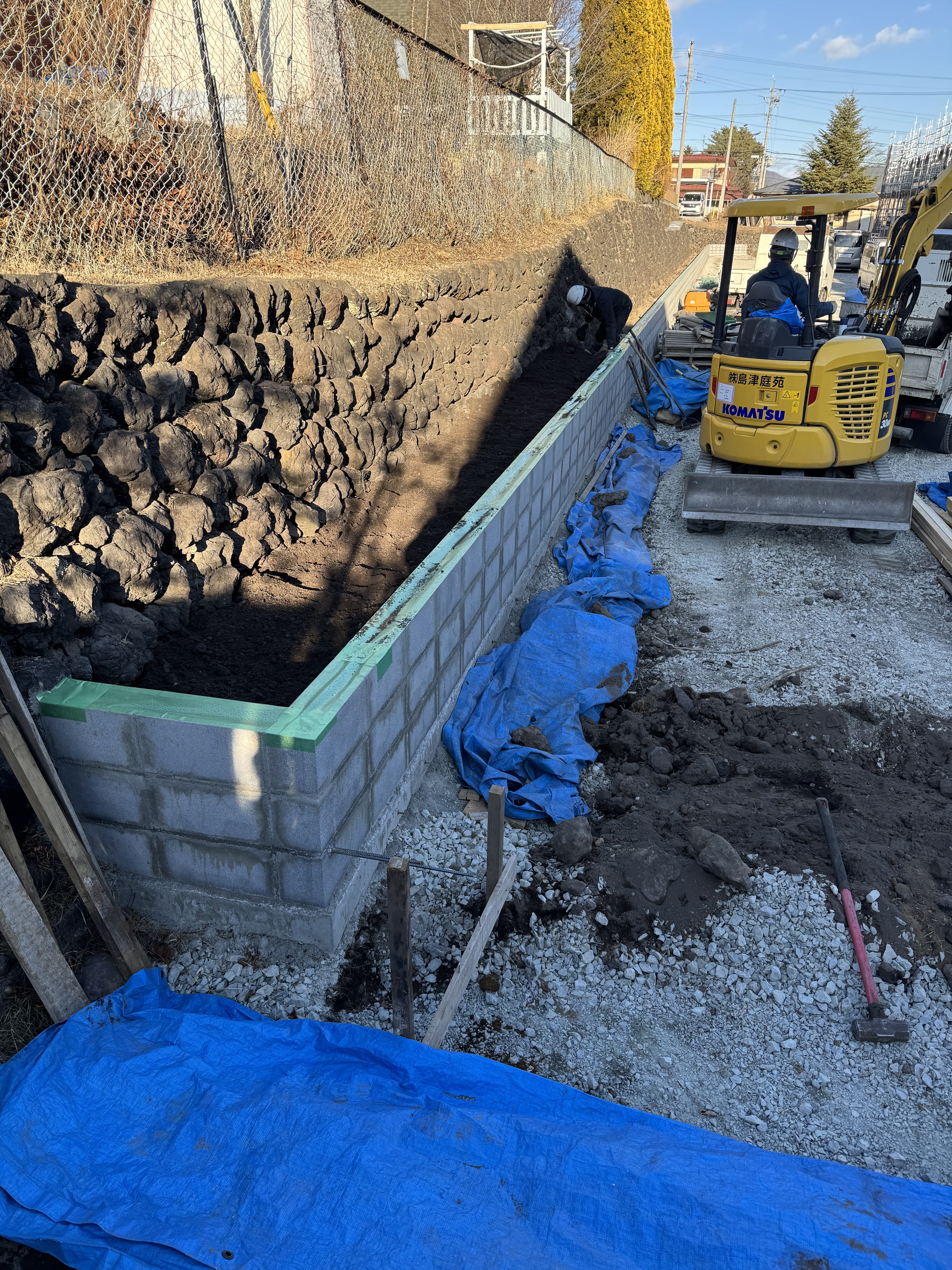 7時30分から16時45分、DHS様邸、ブロック基礎の掘削5m、砕石入れ約36m、ブロックの埋め戻し、丁張りかけ、砕石2m3