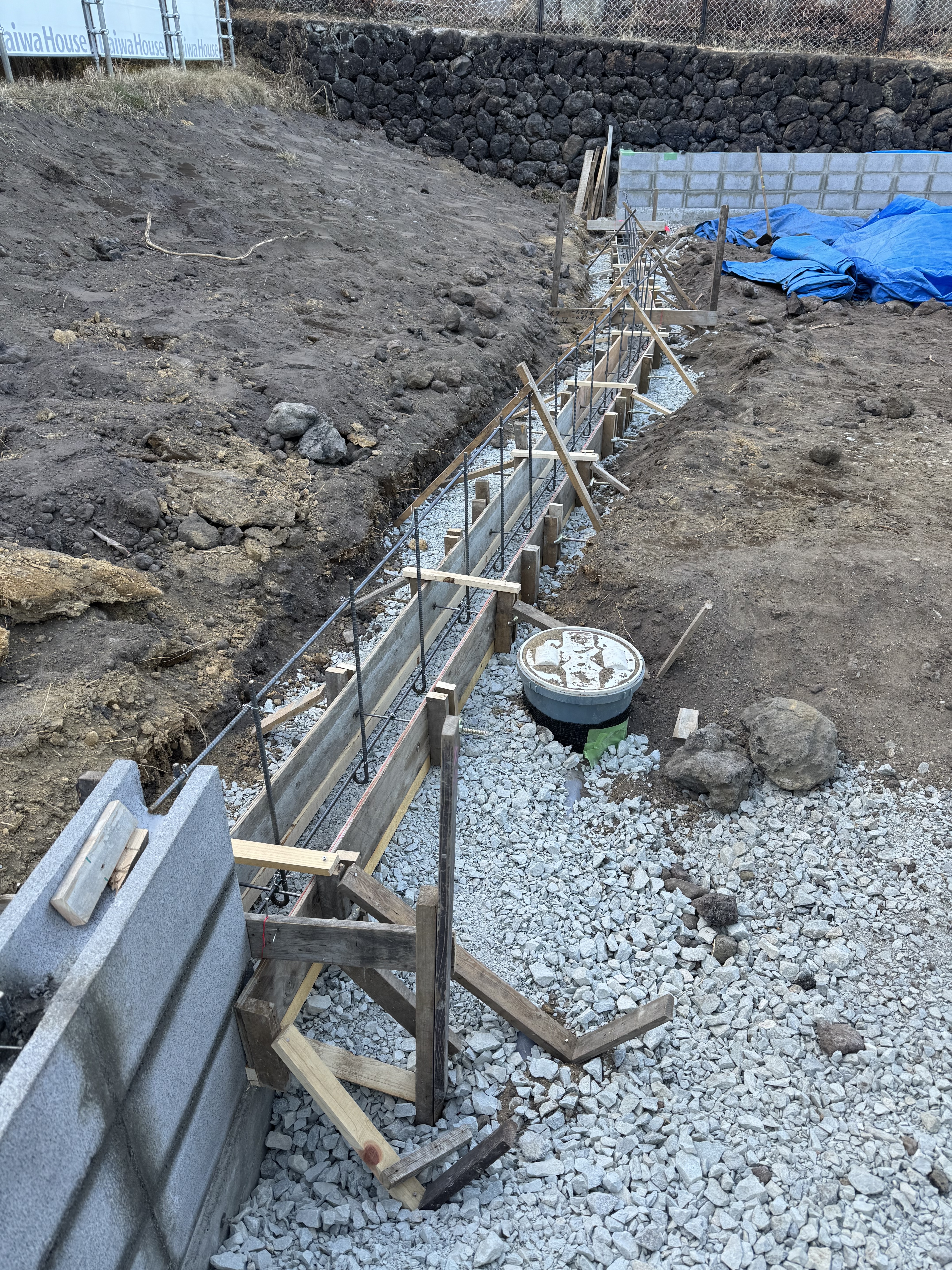 7時30分分から16時45分、DHS様邸、西側ブロックのベースの型枠、鉄筋組み立て、約11m、南側型枠組み立て、約10m