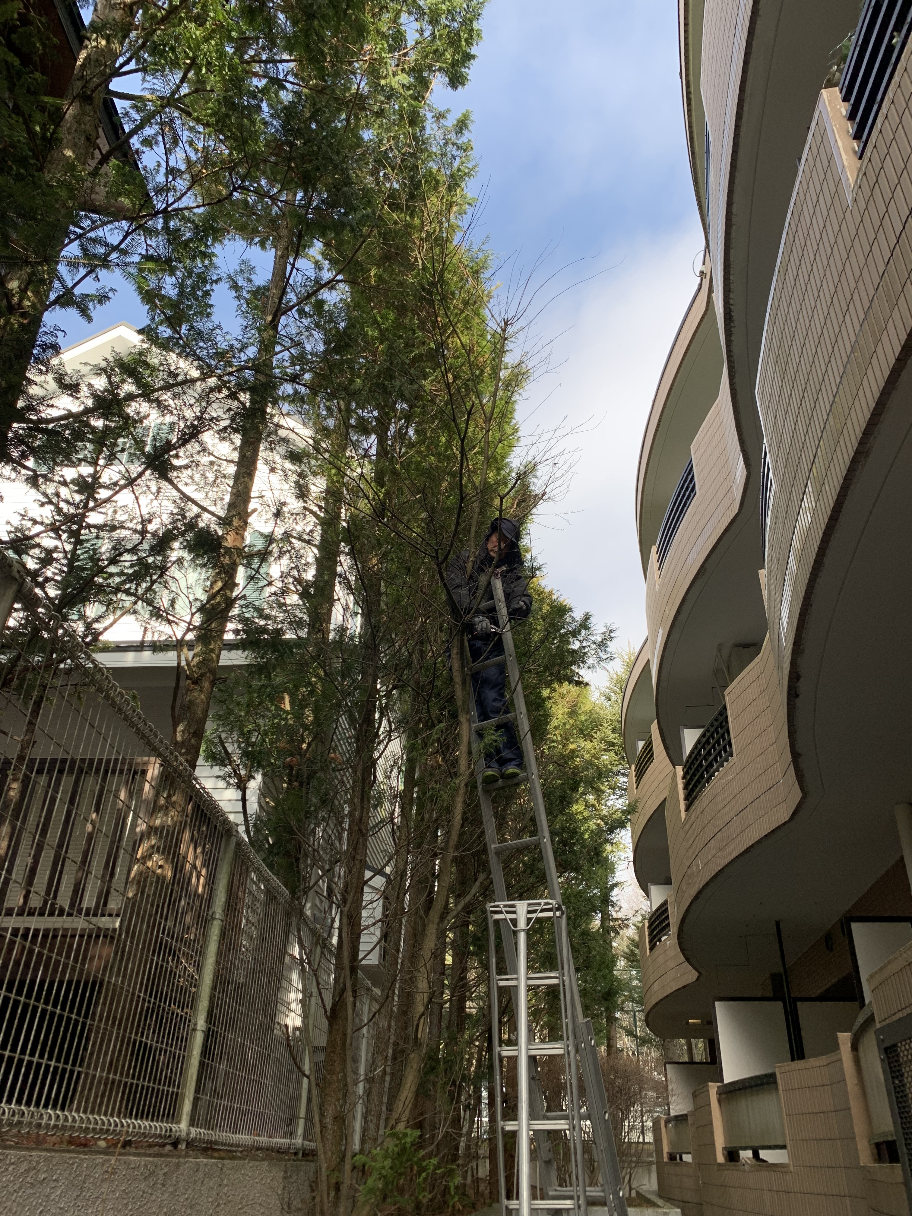 マンション理事長と打ち合わせ(今回の管理でやるはずでなかった西側のヒバとモミジの剪定を頼まれる)