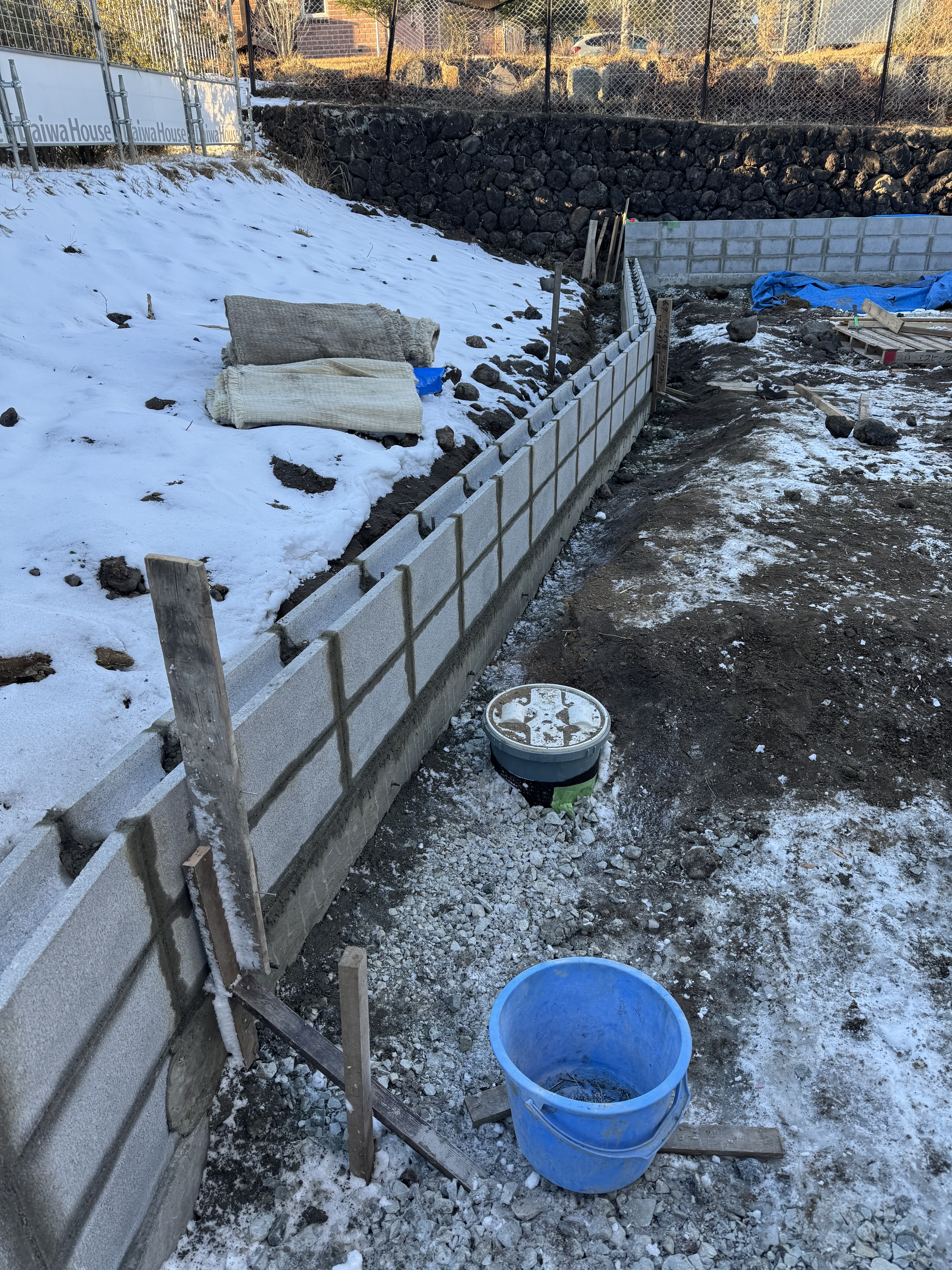 7時30分から16時45分、DHS様邸、西側、ベースの型枠ばらし、西側、ブロック積み11m、2段、南側、ベースの型枠組み立て約10m