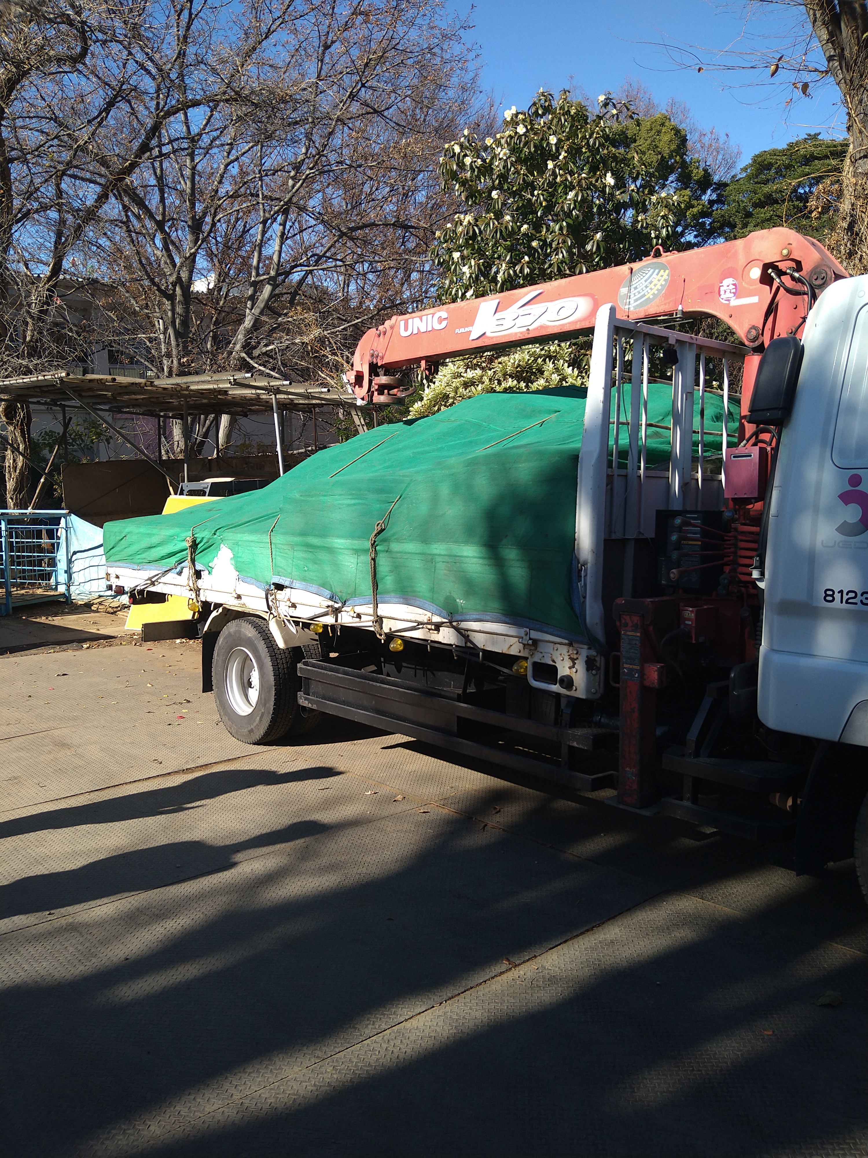 寒冷紗、コンパネ等を積んで現場に顔を出し、リース屋から4㌧ユニックを借りて寒冷紗やコンパネを移して川口に植木を引き取りに行きました!エゴ、ソヨゴ、アオキ、アセビ、タマリュウ等を積み込み、夕方現場に搬入、荷下ろしをしてリースユニックを返却しました!