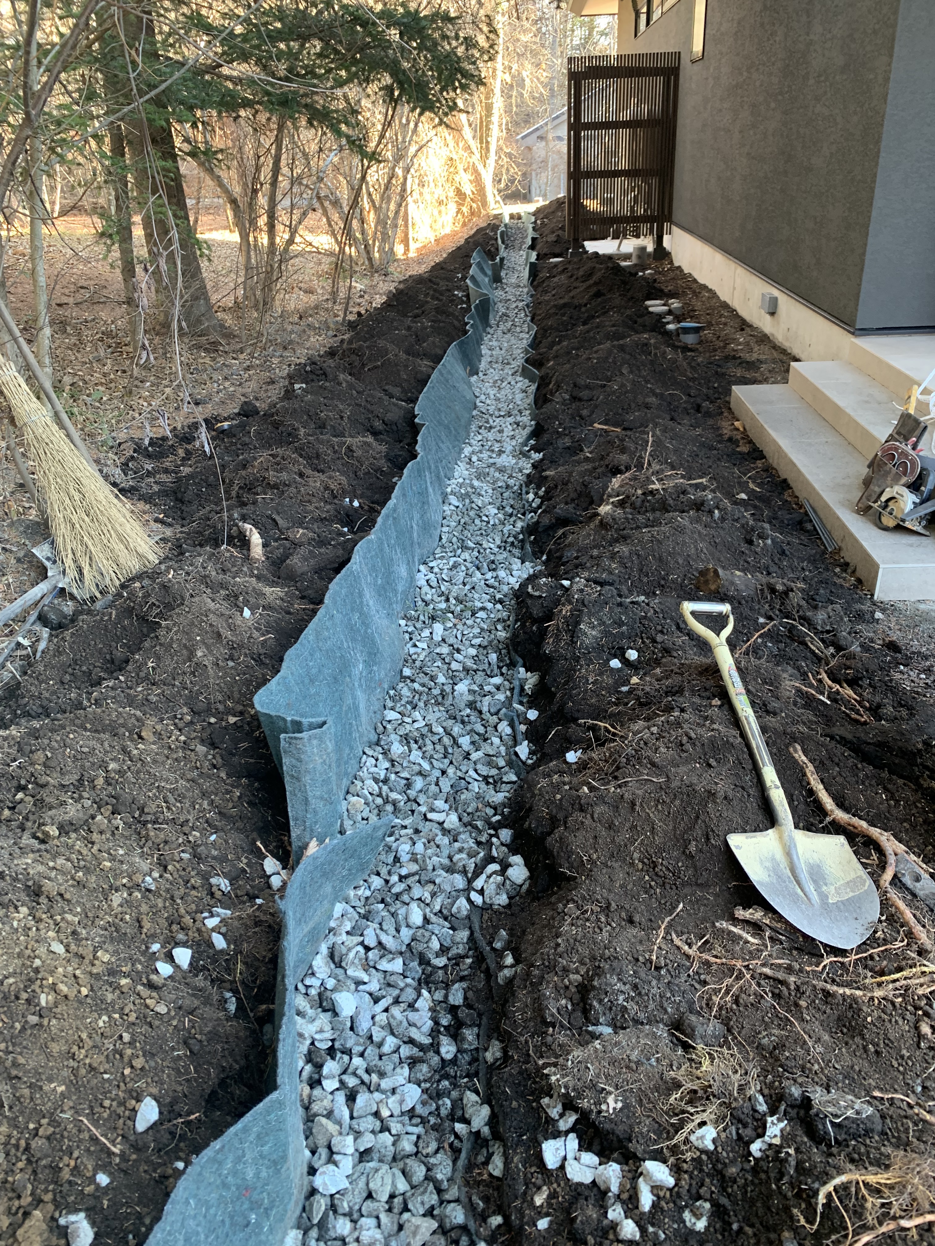 暗渠位置出し、掘削、暗渠パイプ(100ミリ)設置、40ミリ単粒砕石入れ(資材屋さんから単粒砕石2.0運搬)、埋め戻し