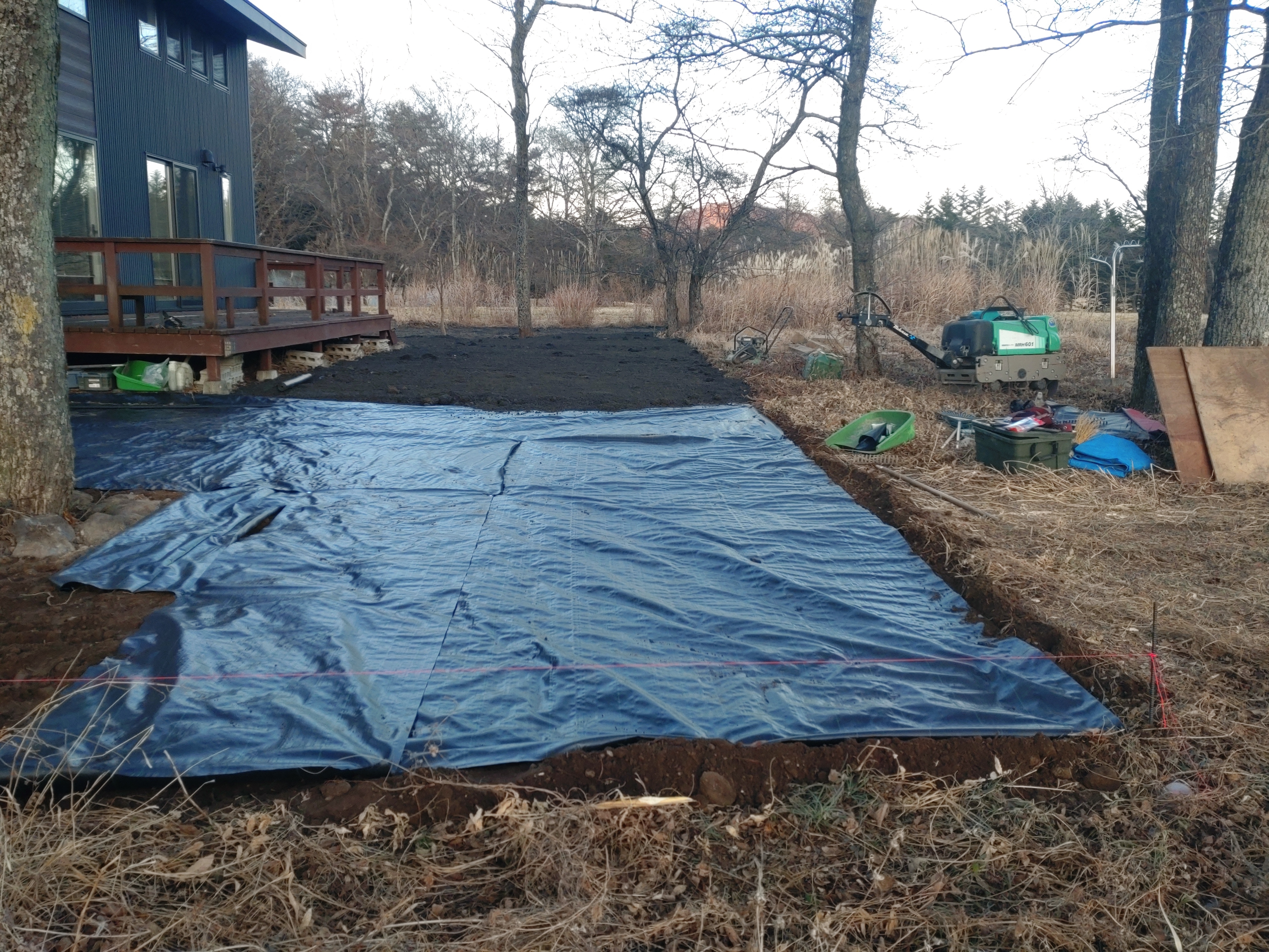 整地作業、ローラーかけ、ふりくを取りながら防草シート敷き