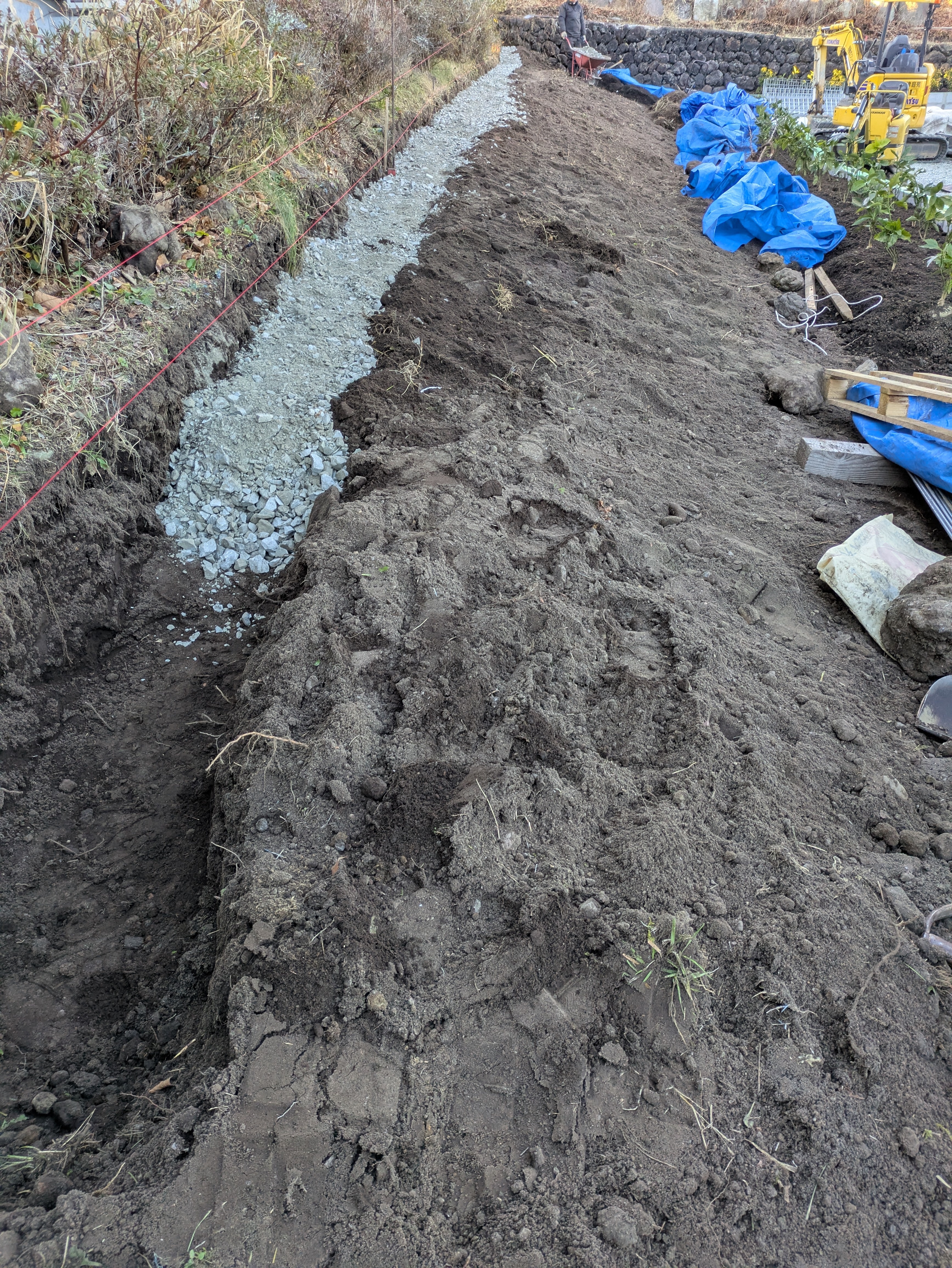 お隣さんとの境界地先ブロックの床付 砕石入れ プレート転圧