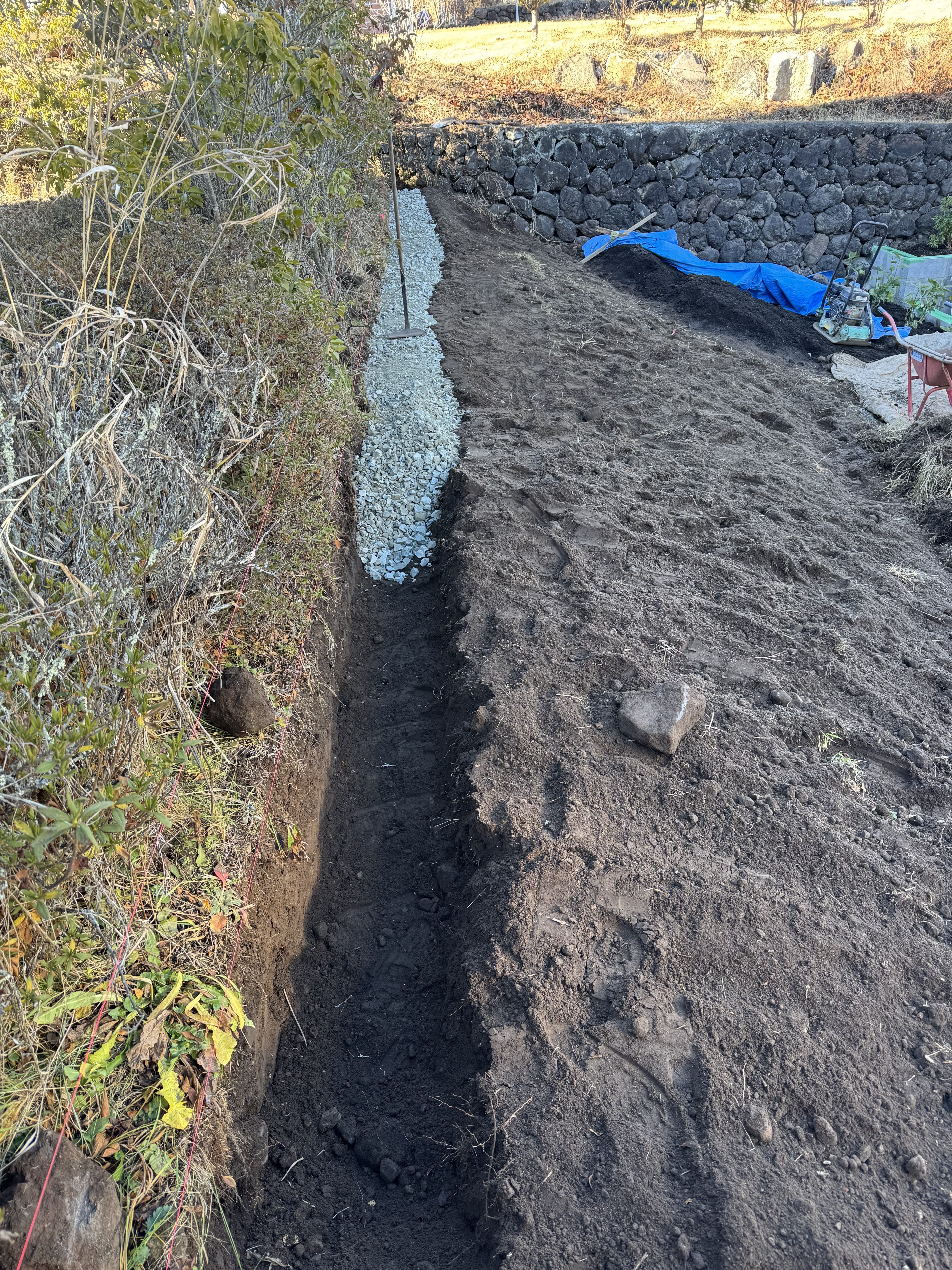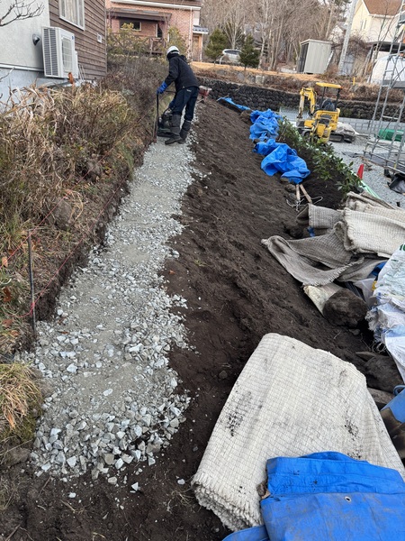 7時30分から17時、DHS様邸、ブロック積みのベースの脱枠、仮囲いバラし、地先境界ブロックの床掘、砕石入れ、転圧、25m