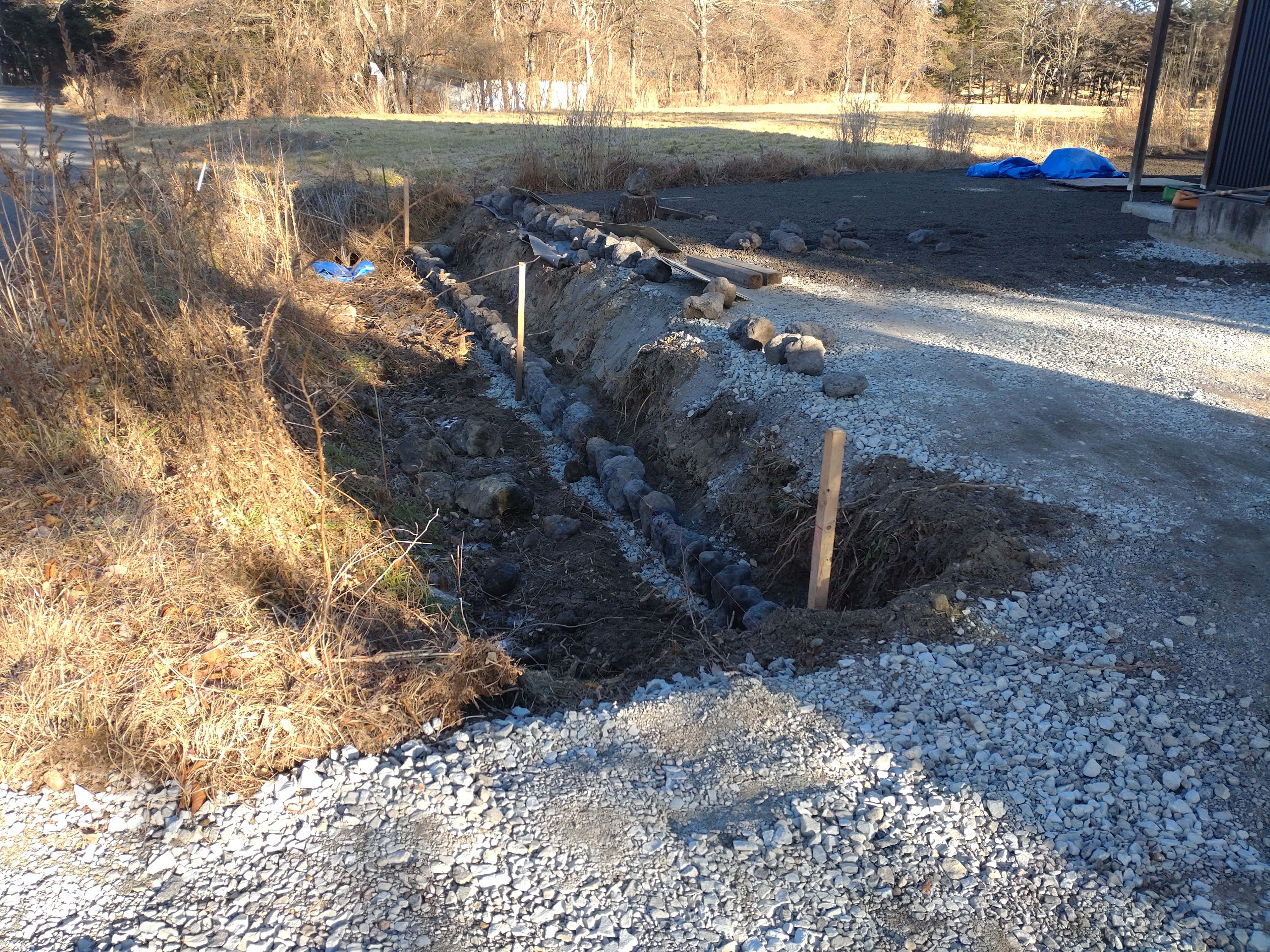 石積み丁張り出し(丁張りにかかる切り株を根切りソーで伐採)、会社置き場から浅間石250〜300mmを110個拾い出し運搬、資材屋さんで洗い砂1㎥運搬(YAMさん)1段目石積み作業、19m並べ、11mモルタル打設