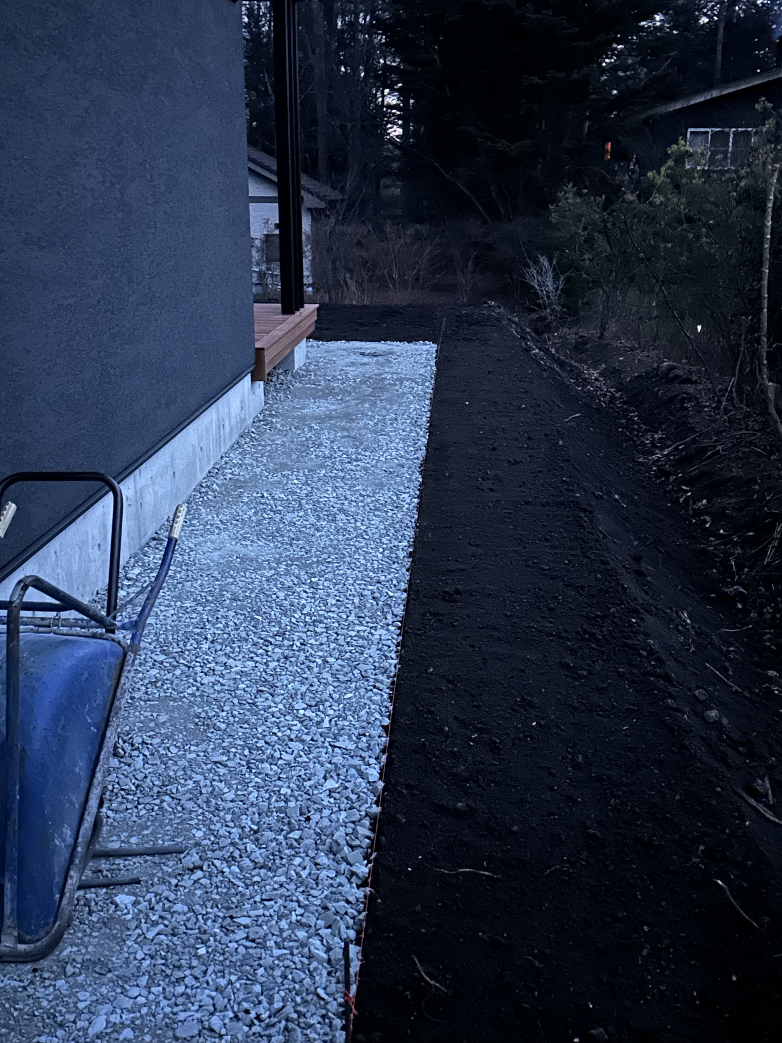 一輪車で駐車場と家の間の狭い場所採石敷均し。