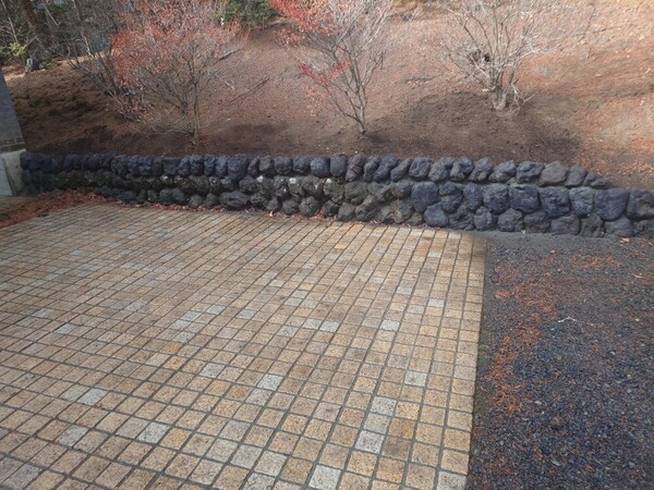 既存石積の裏を掘削してモルタルを敷いて浅間石を1段積んで嵩上げする。