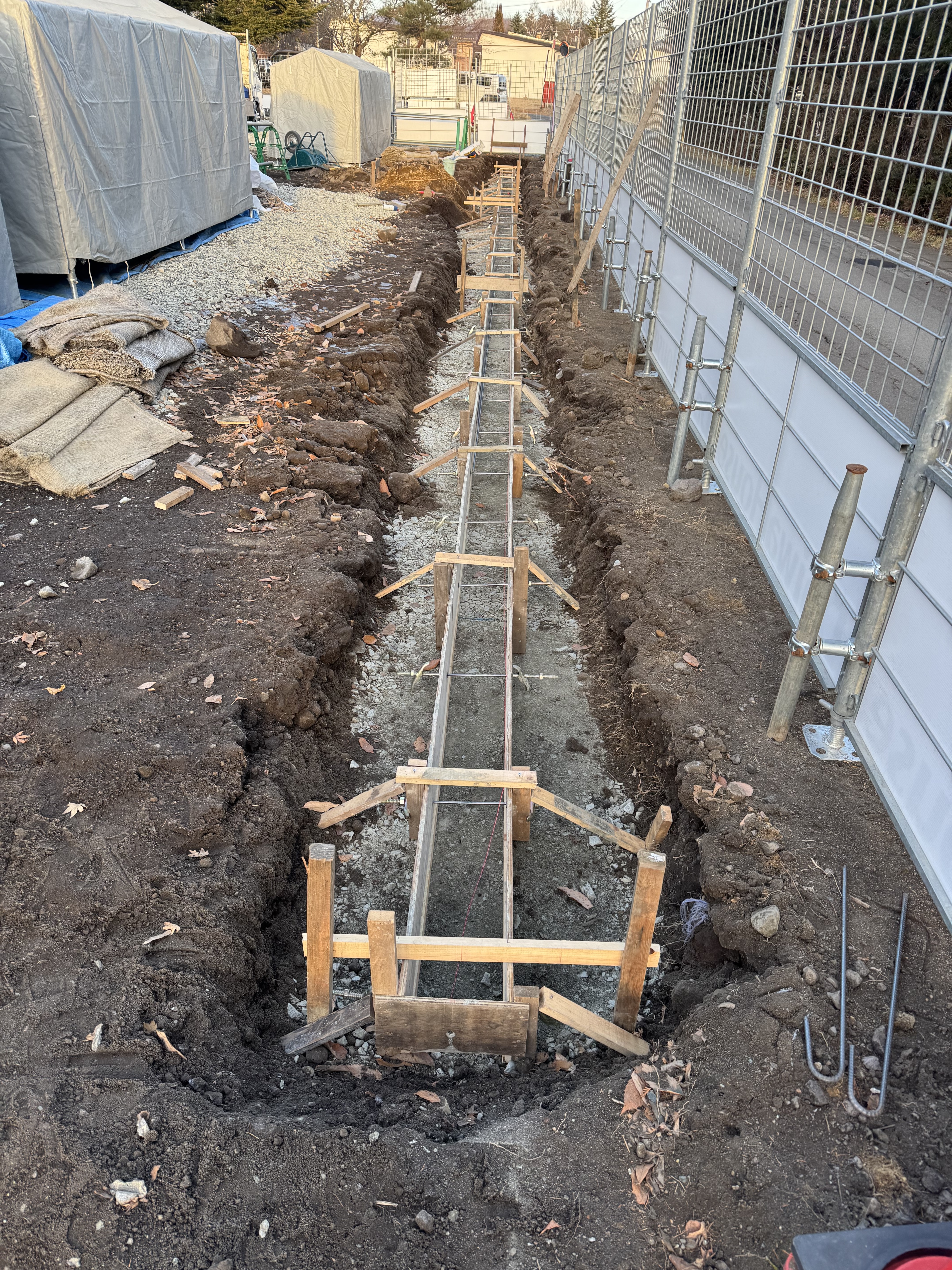 7時30分から17時、DHS様邸、前回打ったベースの脱枠、型枠組み立て、21.4m、ミニユンボ回送、洗砂0.5m3ストック、