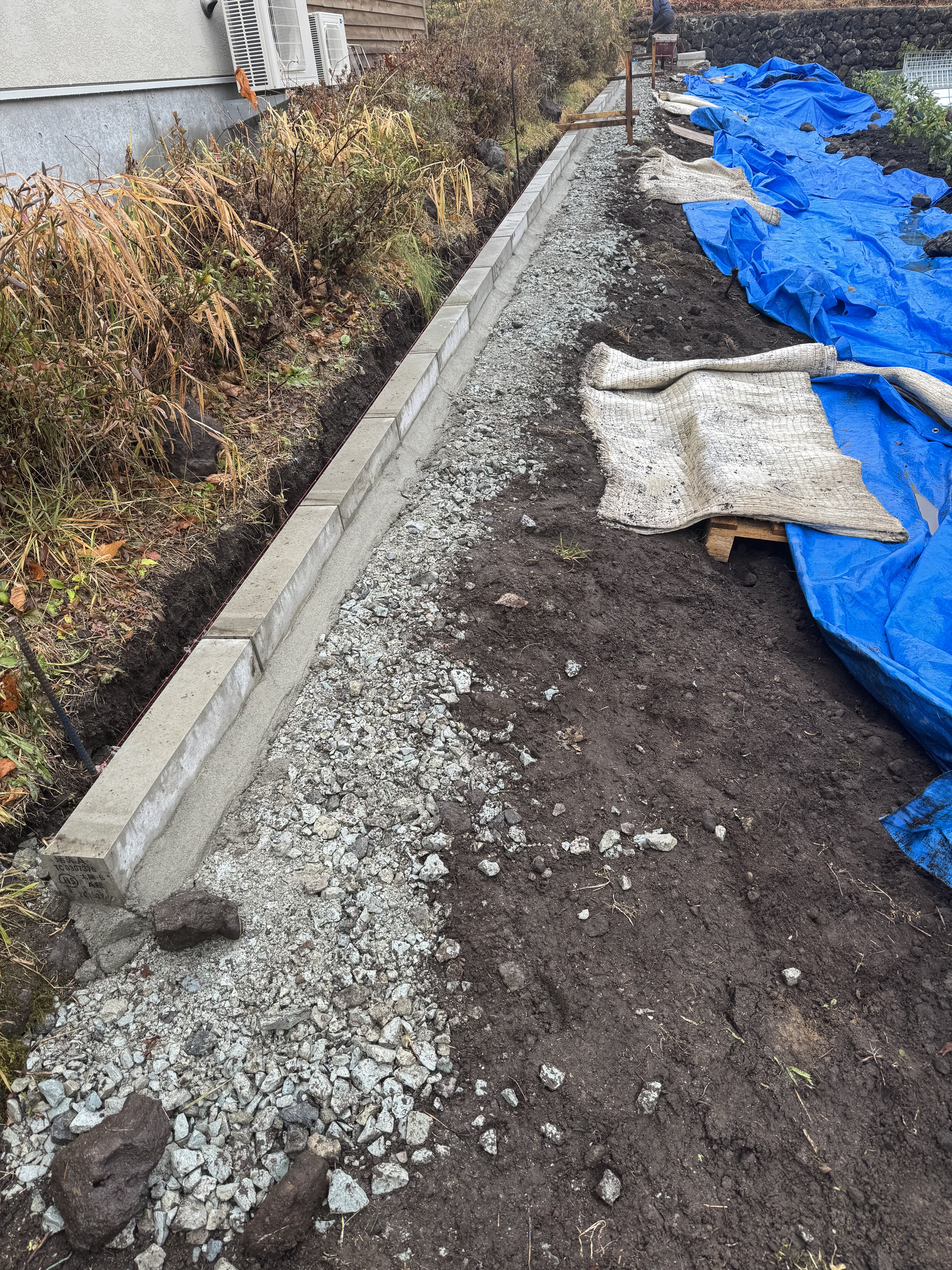 8時から16時30分、DHS様邸、丁張りかけ、地先境界ブロック運搬、地先境界ブロック40本(24.4m)布設、足場下の養生、ブロックのベースの鉄筋の段取り