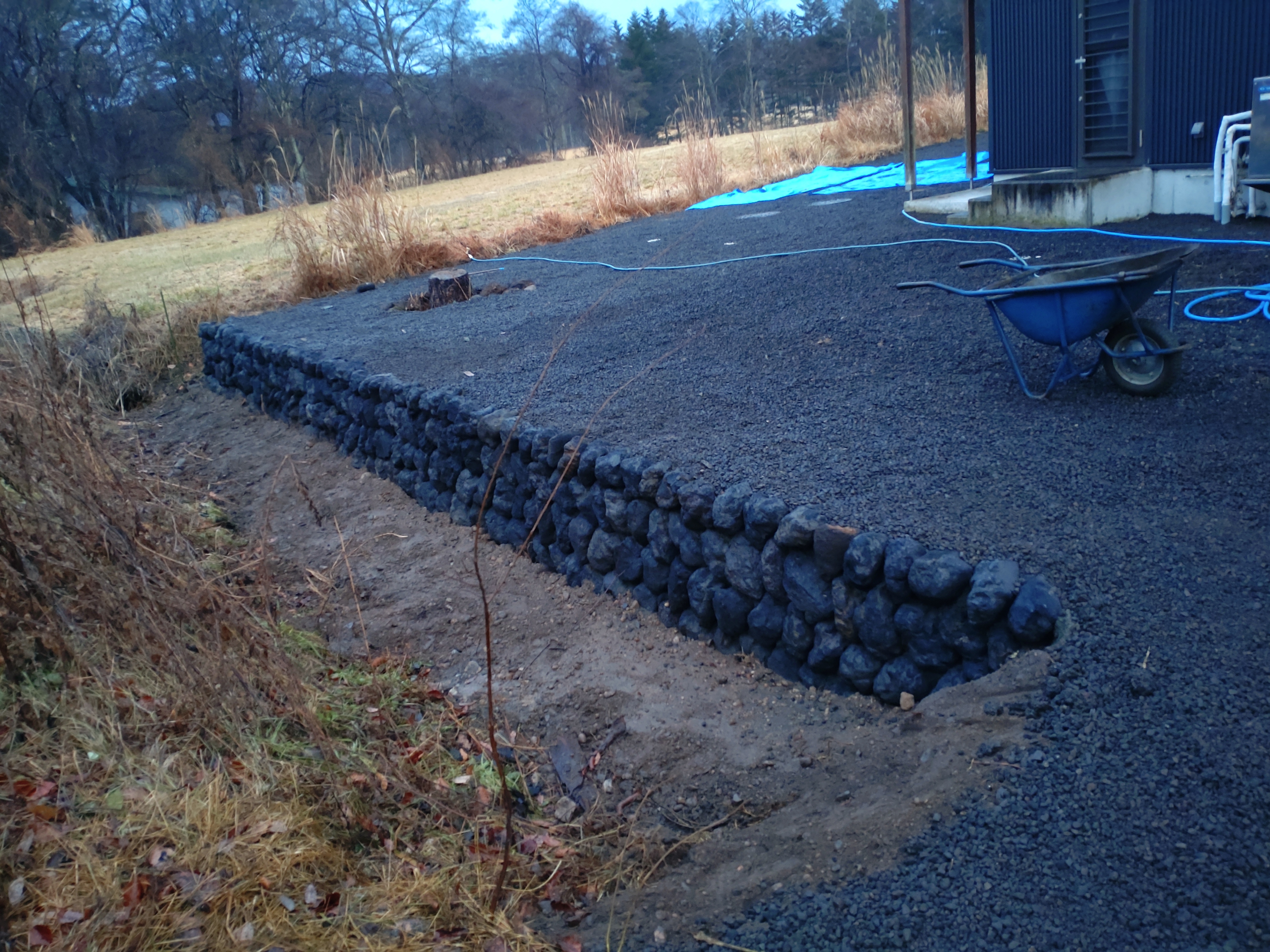 、駐車場の石積みの際砕石入れ、プレート転圧、整地、仕上げ作業
