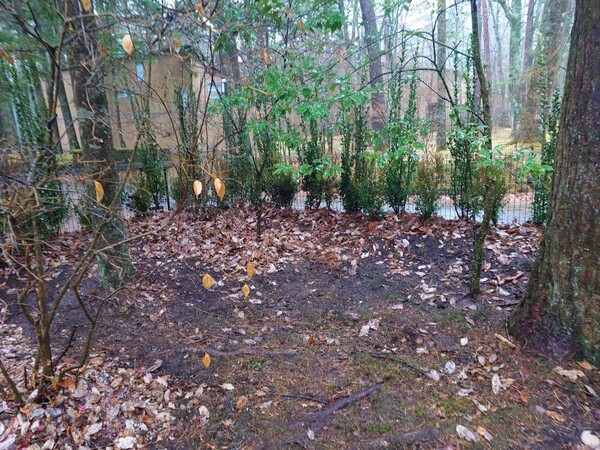水やり、整地。冬季養生で落ち葉を植えた木々の根本に敷き込み。
