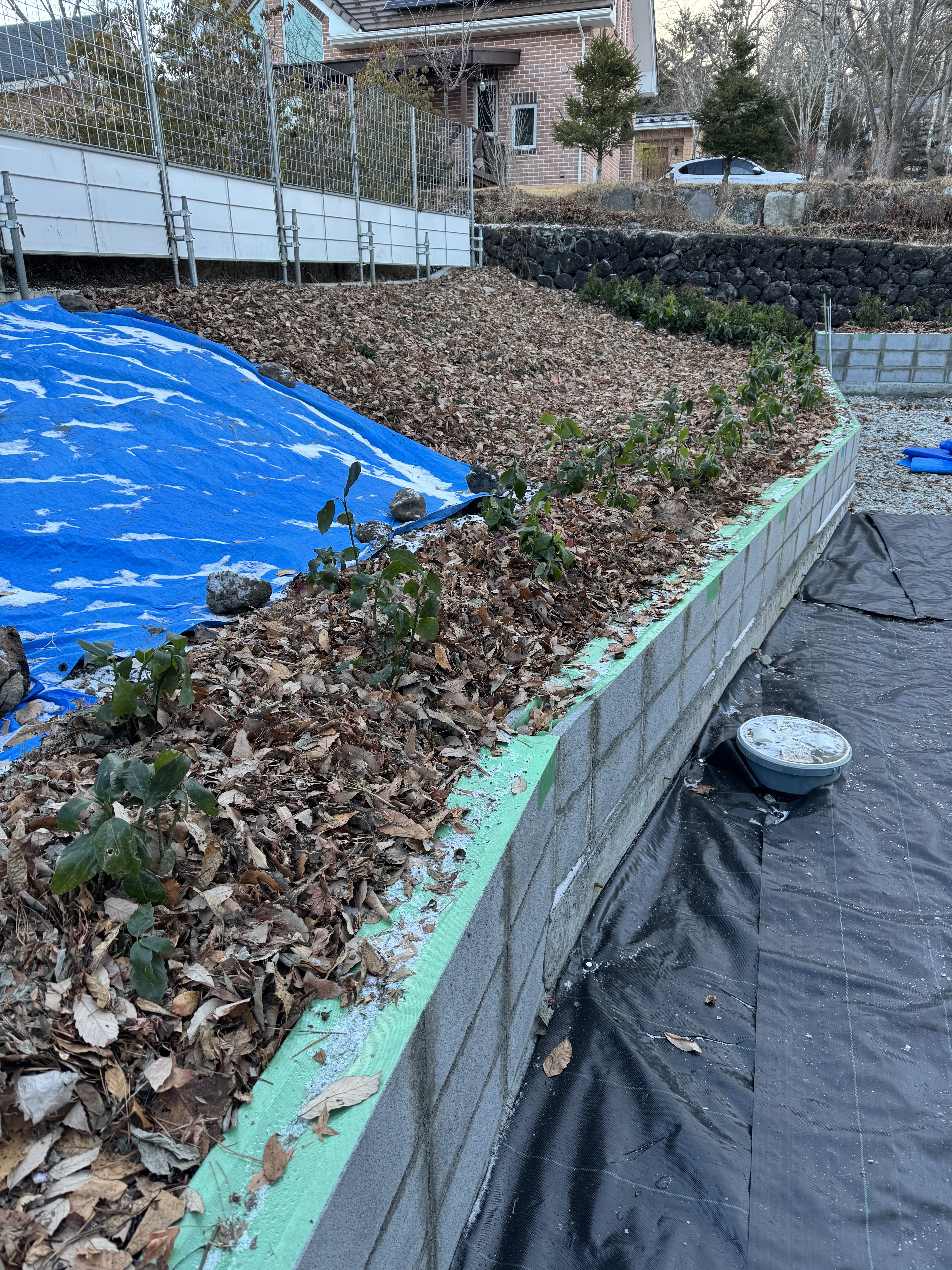 7時30分から16時40分、DHS様邸、凍結防止対策で植木の周りに落ち葉敷き、足場の下に防草シート敷き、片付け、落ち葉の余り、パレットを置場に運搬、