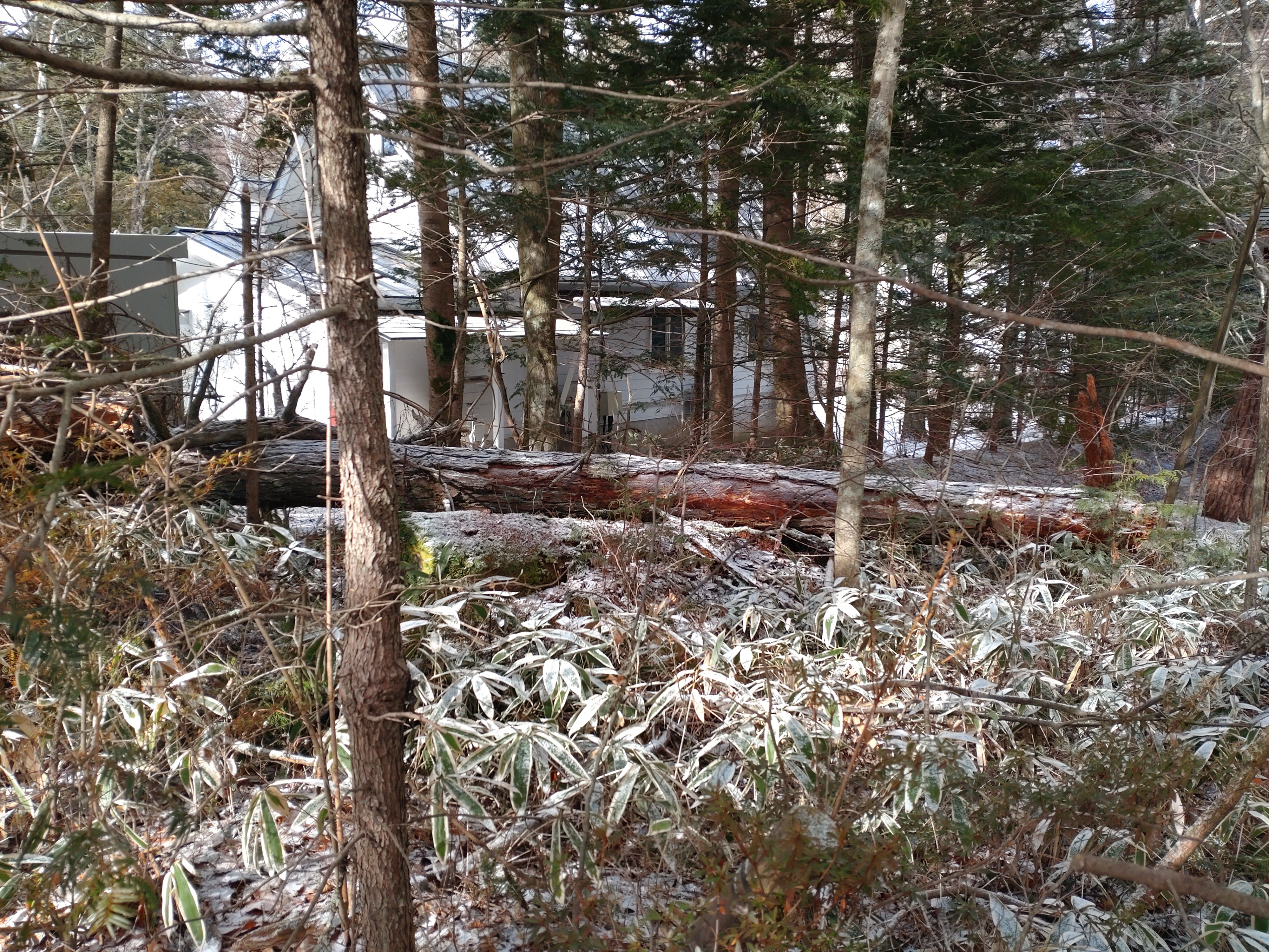 風倒木をユニックで吊りながら伐採、枝片付け、積み込み、お隣り出た枝ゴミ片付け、清掃(風倒木2本)