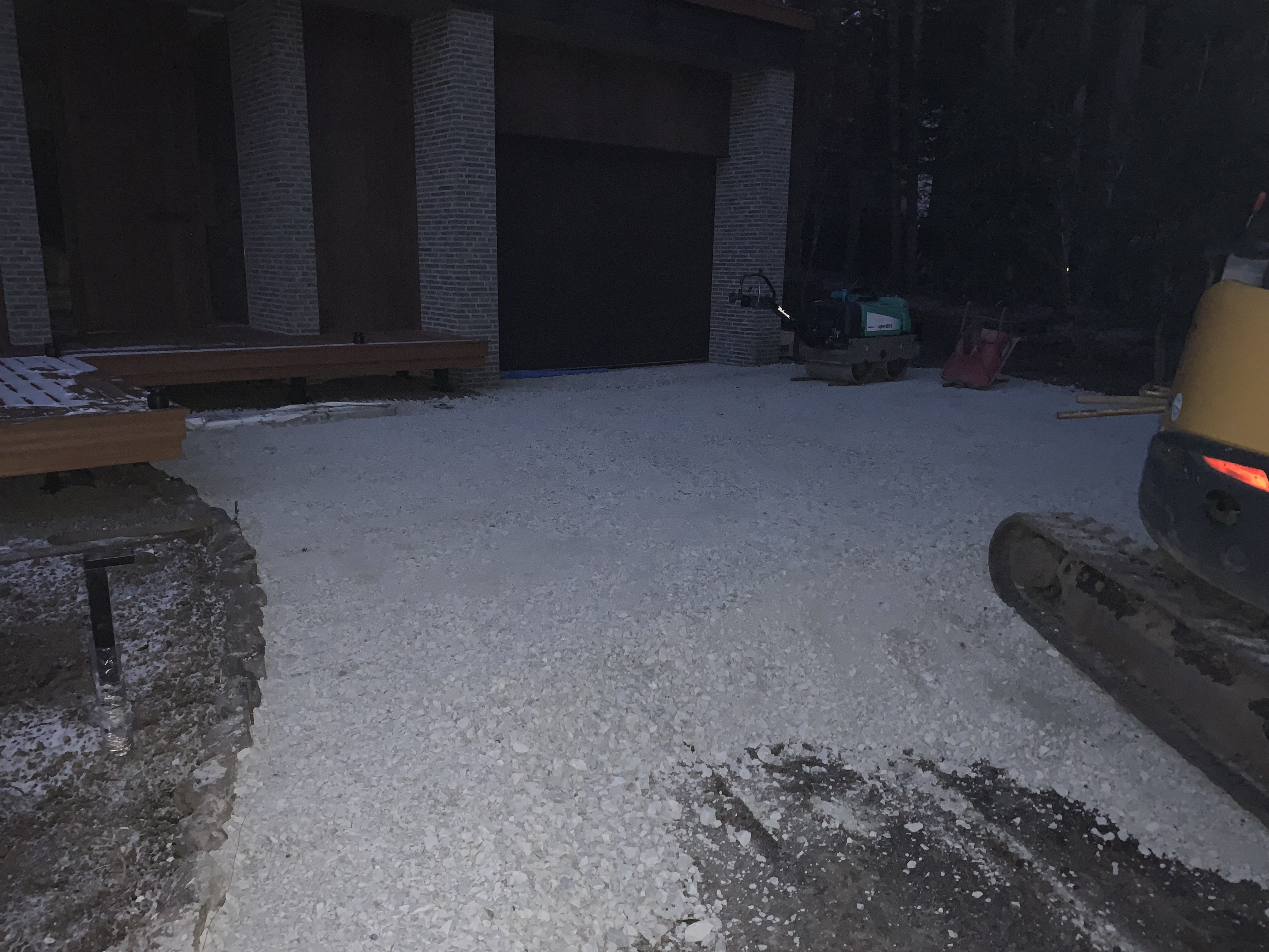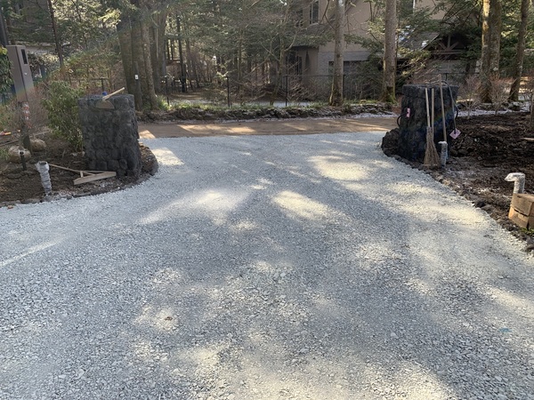 駐車場砕石入れ(C建設様置き場から砕石2台運搬)、転圧完了