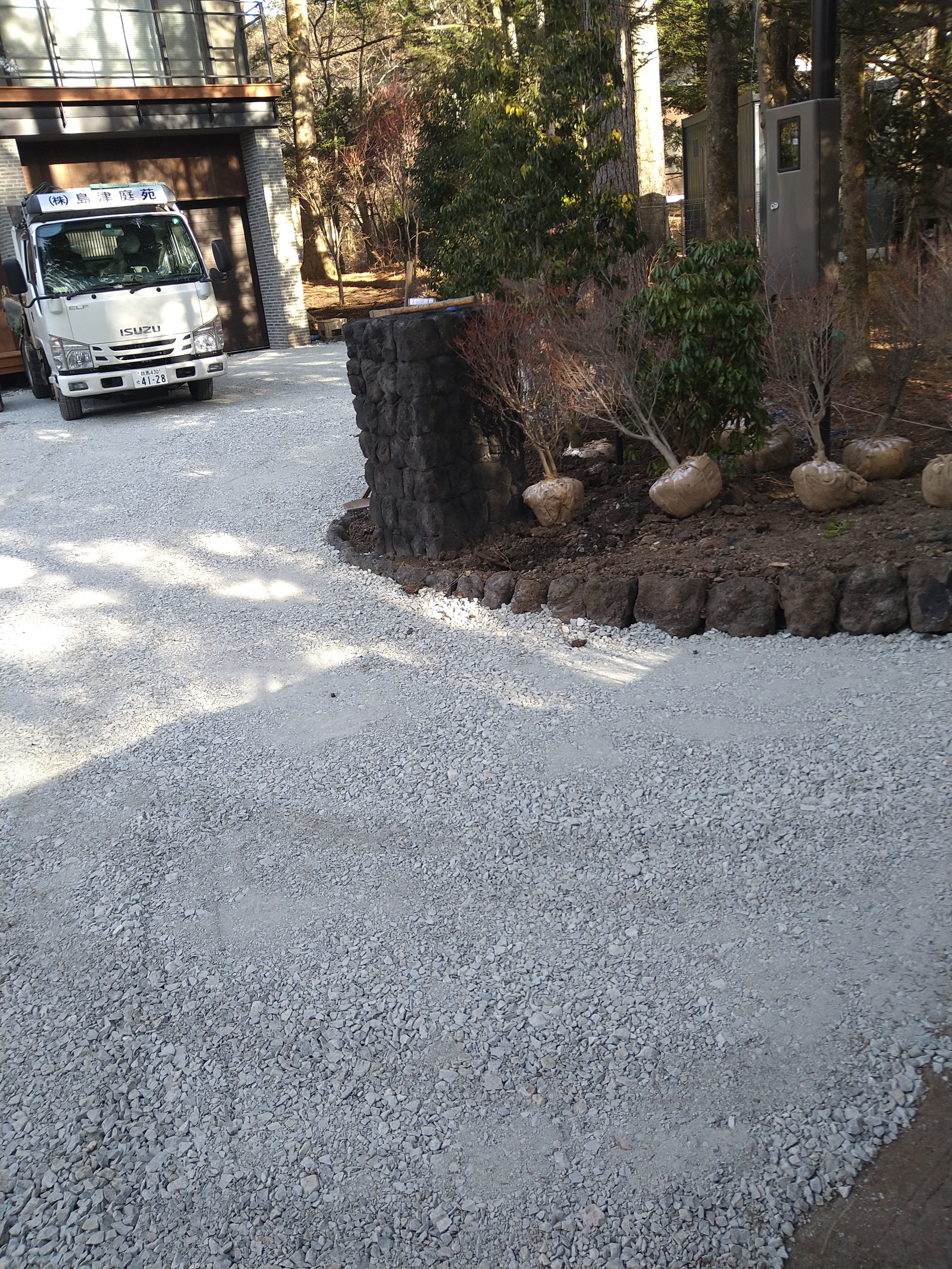 路盤工完了したので、自分は余ったストック砕石を片付け、H圃場からの帰り荷で、ドウダン15本を掘り取り積み込みし、空いたボディに落ち葉を積んで戻りました!ドウダンを配って、シラカシ、モミジ、モミ等の植栽補助をしました!植栽が完了してドウダン等植栽した木の根本に落ち葉を敷きました!落ち葉敷きが終わったので、ストック砕石の片付けに戻りました!H圃場へ運搬しシートをかけました!