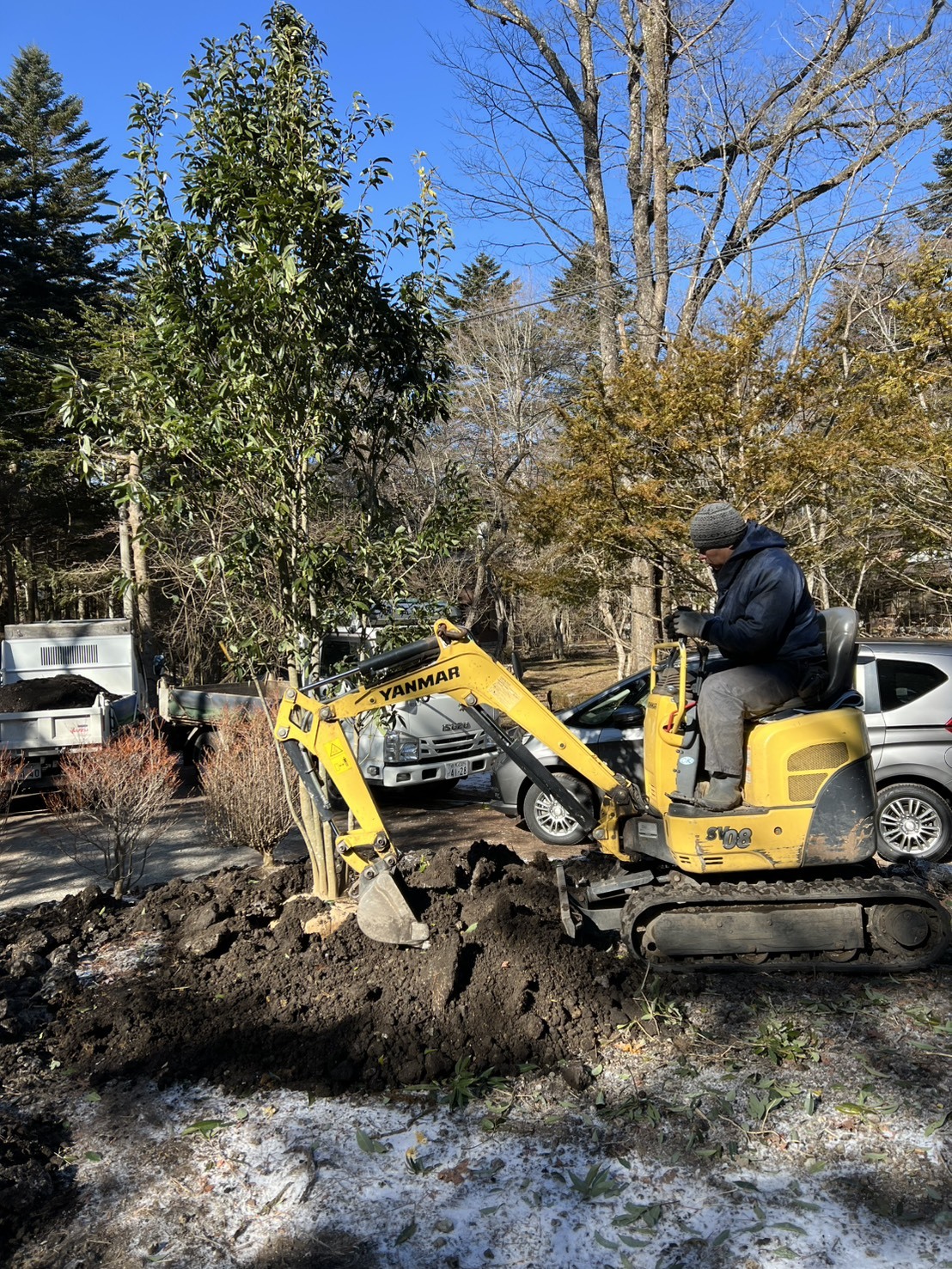 アオハダなどを植え込む。今日は地面がカチカチに凍っていてブレーカーを使用して