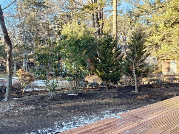 REIと中庭植栽、目隠し植栽、シラカシ、ソヨゴ、アセビ、シャクナゲ、モミ、モミジ4本、