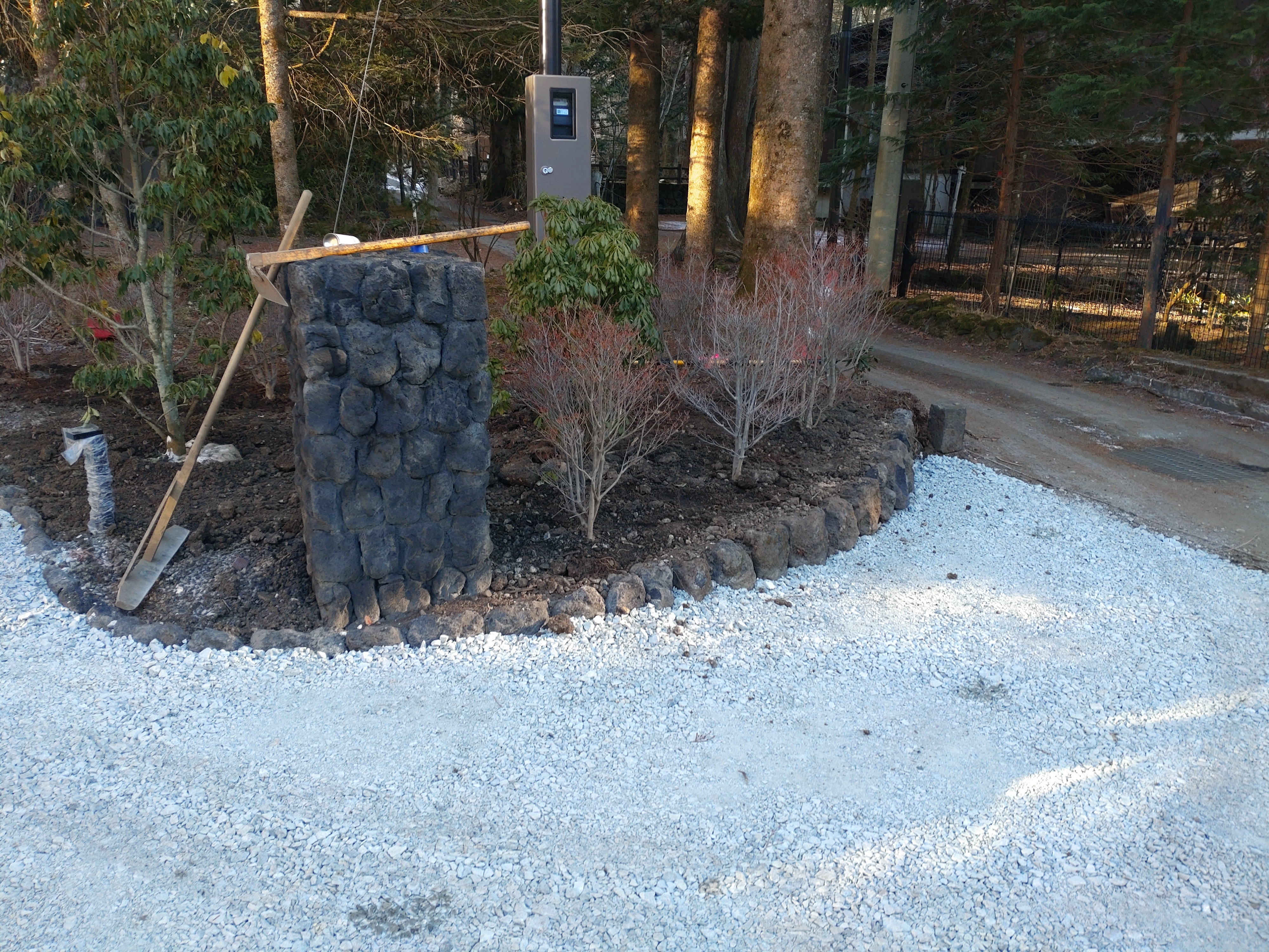 ドウダン植栽(ドウダン植栽箇所マーキング、ドウダン配り、ミニバックホー、ブレーカーに替えてバックホーを使用し穴掘り、ドウダン植栽)