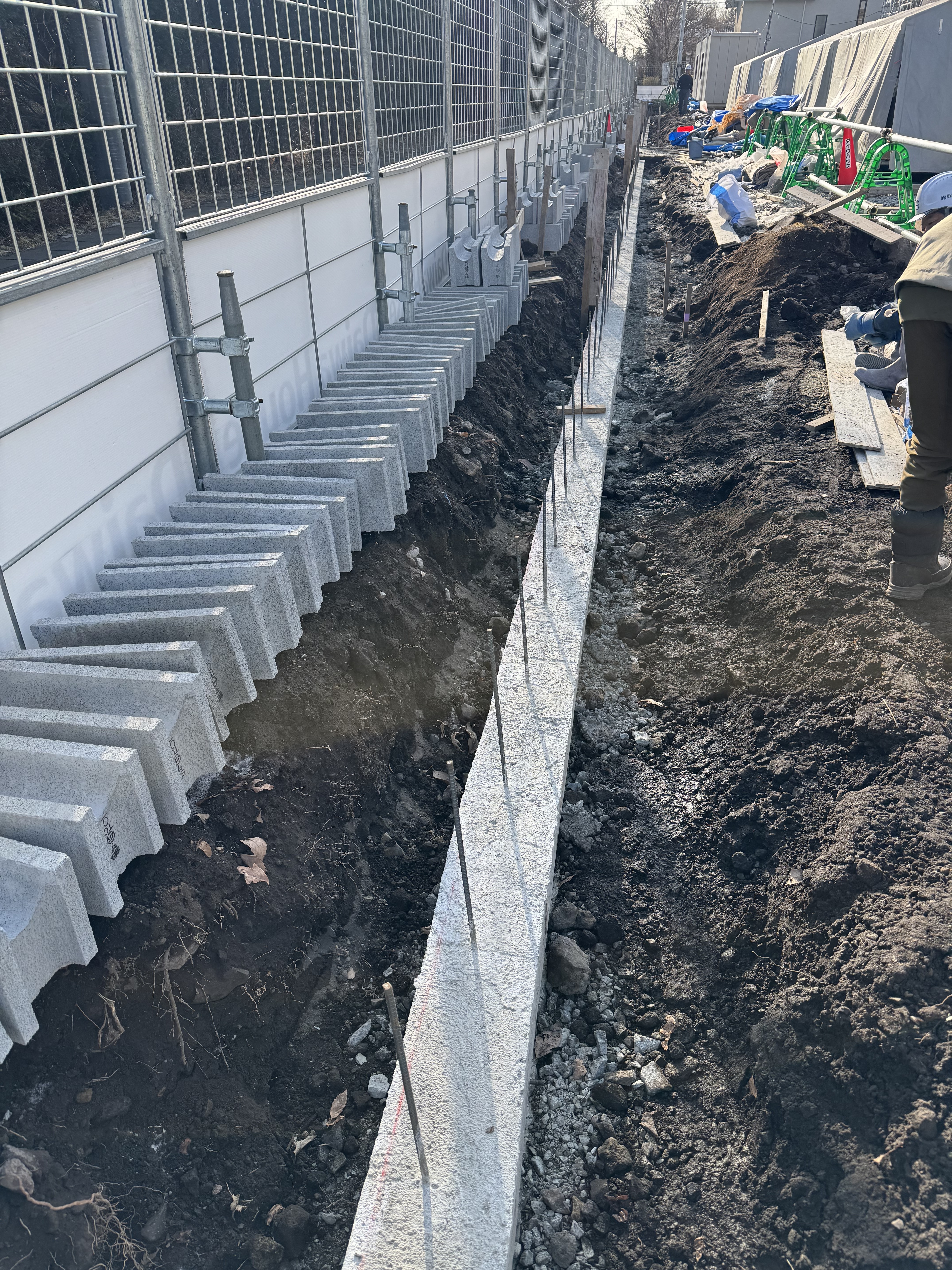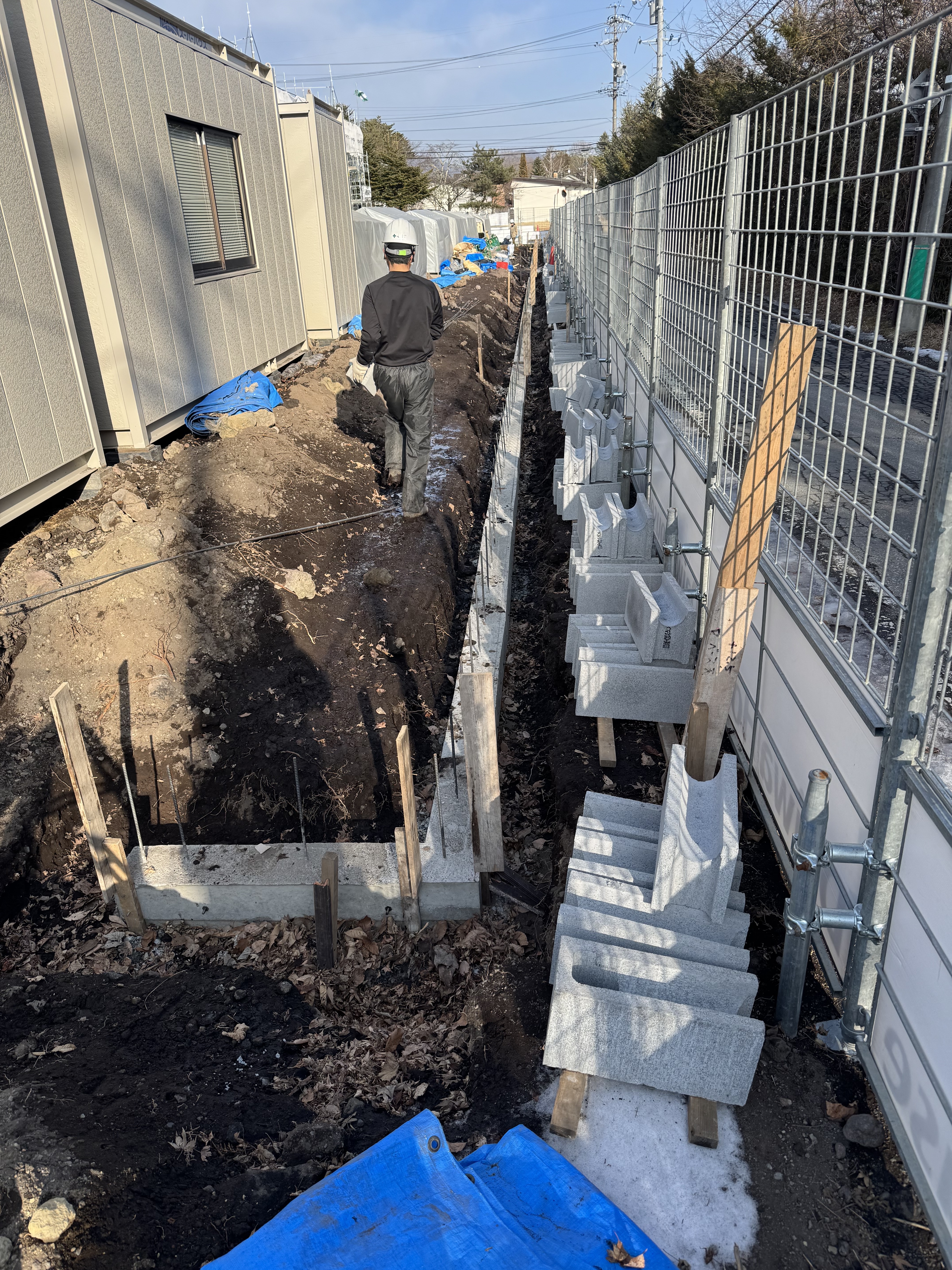 7時40分から16時50分、DHS様邸、ブロック積みベースの脱型、型枠の掃除、丁張りかけ、ブロック配り