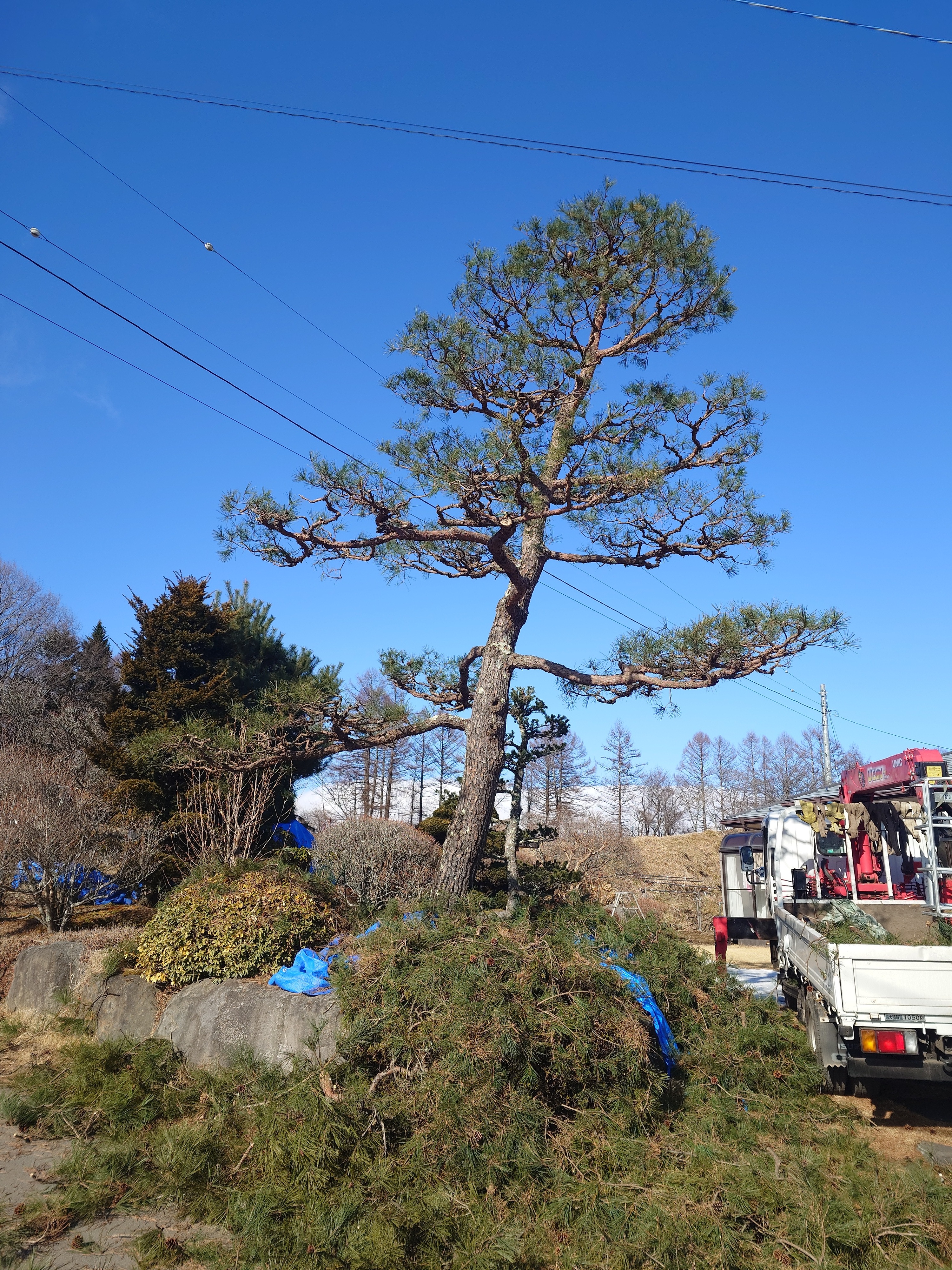 ユニックを使用して樹高7m.4m.6mのアカマツ剪定、イチイ他刈込。