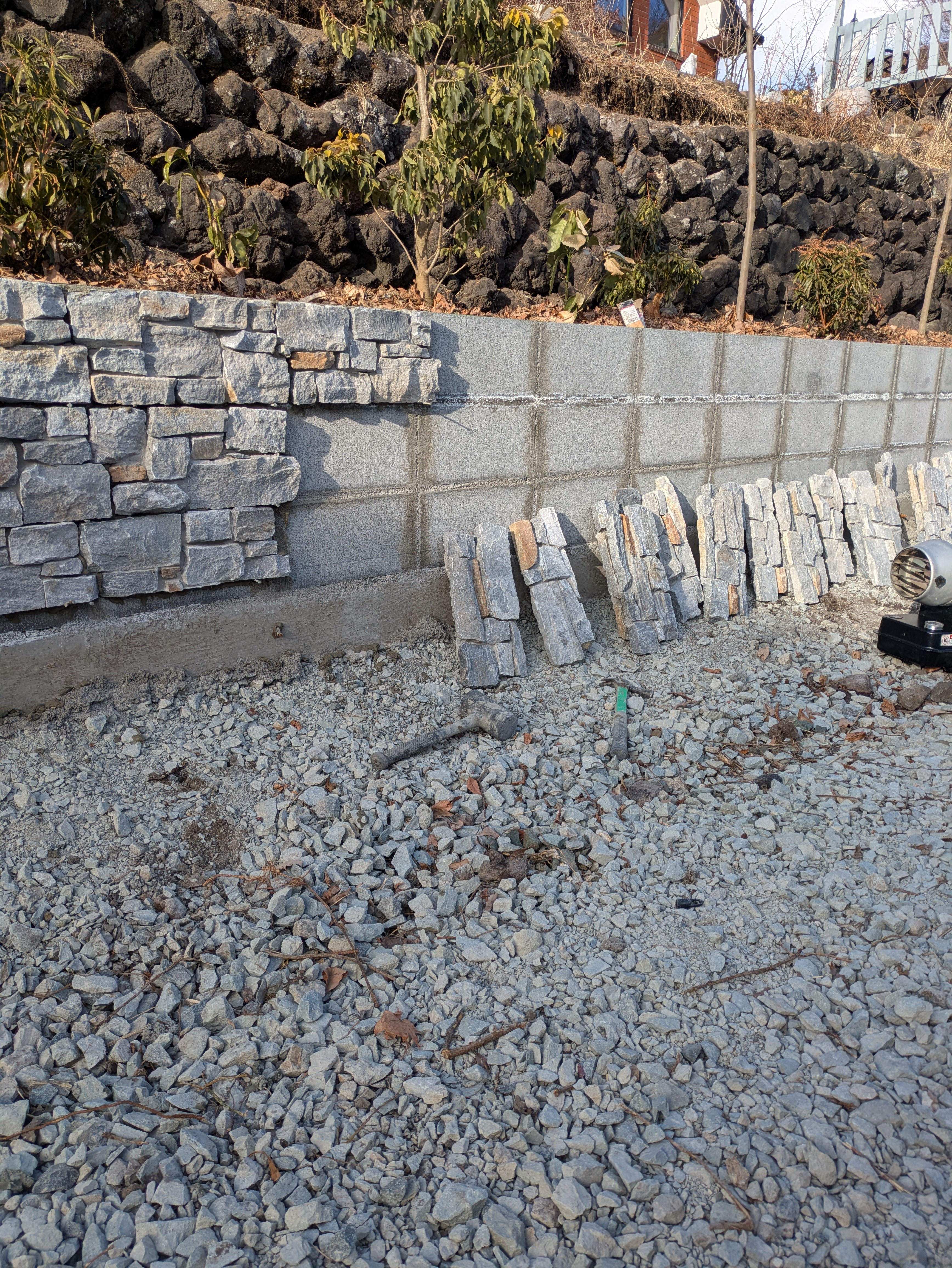 北側のブロックにストーンタイル貼の手元 目地 養生 作業です。